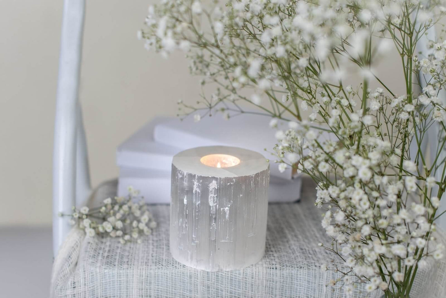 Естетическа стойност: Селенитът, известен със своя бляскав и прозрачен ефект, придава на свещника специален чар и изключителен дизайн.