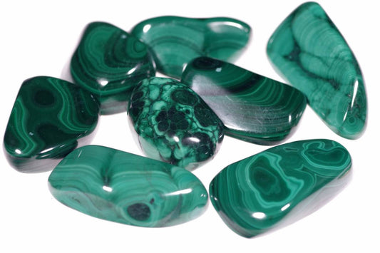 Malachitas – ryškiai žalias vario karbonatas, išsiskiriantis koncentruotomis, ištęstomis juostomis ar „akimis“, primenančiomis medžio rieves. Senovės pasaulyje vertintas už gyvą atspalvį ir dekoratyvų raštą, malachitas ne tik puošė rūmus, bet ir buvo siejamas su apsauga bei prabangos simbolika. Ezoterikoje jis laikomas širdies atvirumo, atsinaujinimo ir drąsos išreikšti tikruosius jausmus akmeniu.