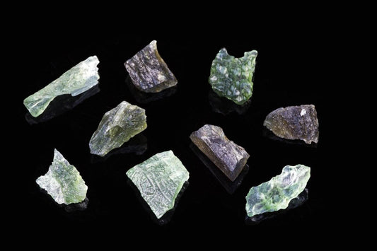 Moldavit – zelenavý, skleněné textury tektit, který vznikl po dopadu meteoritu ve střední Evropě (převážně v Česku) před přibližně 15 miliony let. Jeho vzácnost a tajemný původ spojující mimozemské a pozemské prvky činí moldavit žádaným sběratelským kamenem. V ezoterice je považován za intenzivní transformační sílu, která pomáhá vyčistit záměry, podporovat duchovní pokrok a otevírat nové hranice vnímání.