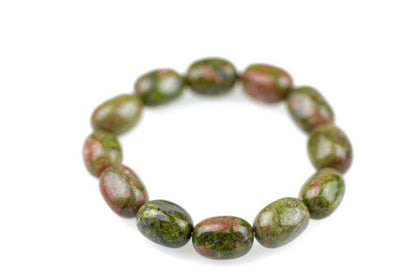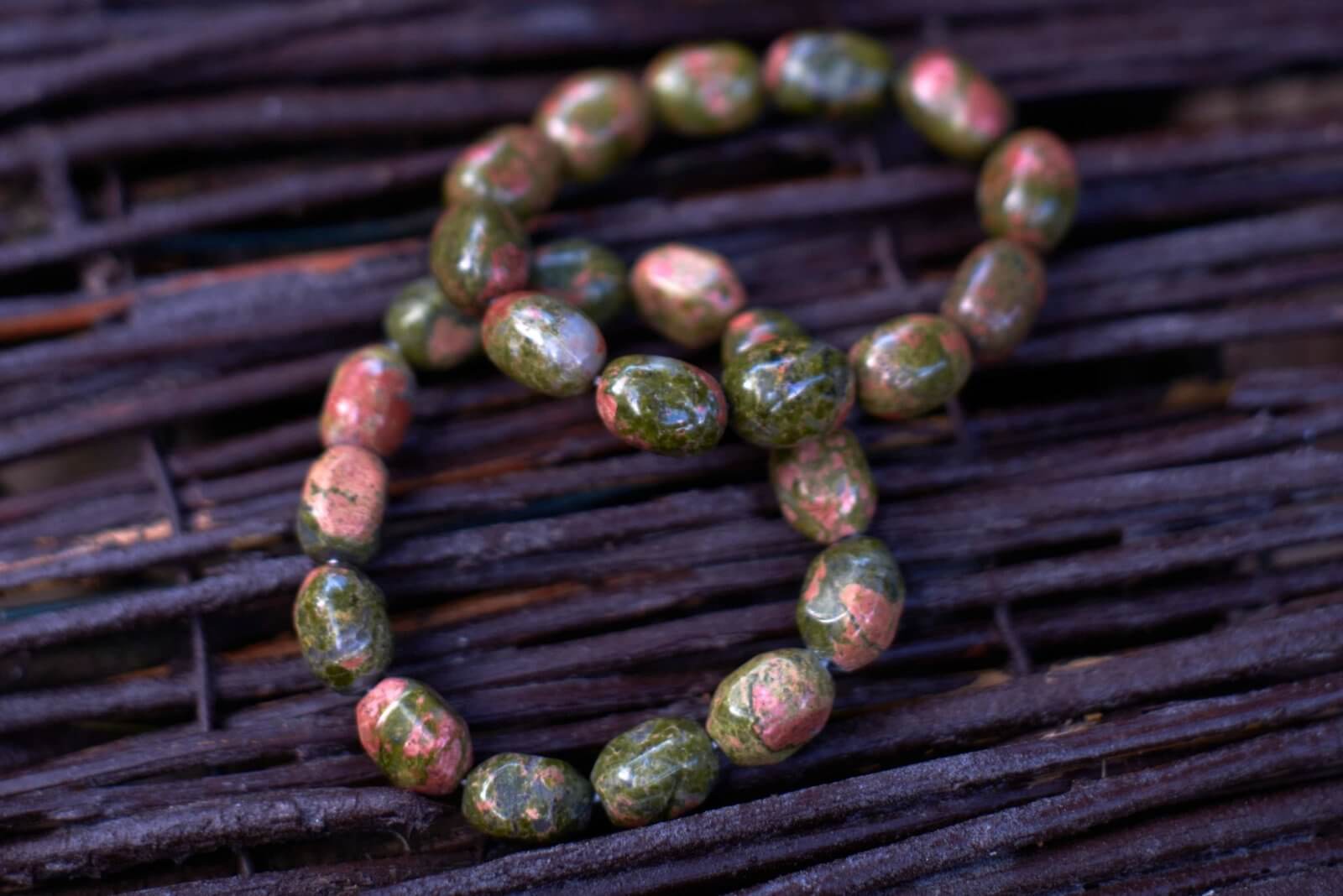 Opdag et autentisk og naturligt smykke, der skiller sig ud med unakittens naturlige grønne og rosa nuancer. Dette armbånd, lavet af ubehandlede unakitsten i naturlig form, er et fremragende valg for dem, der værdsætter følelsesmæssig balance, åndelig vækst og elsker autentiske, men subtile accessories.