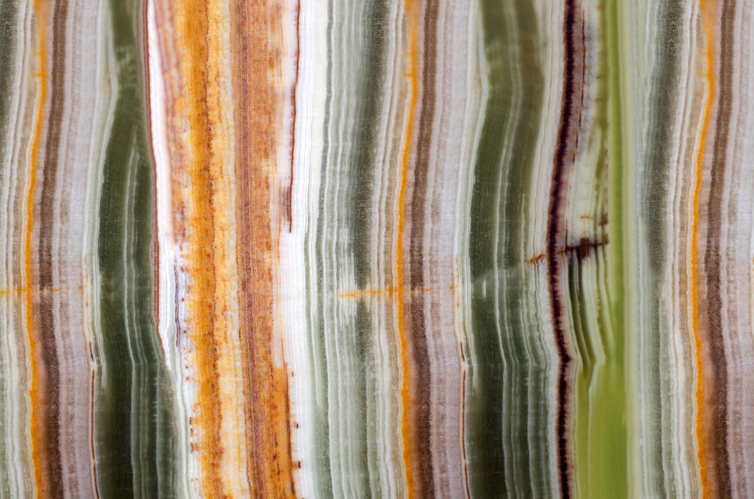 Triibuline kaltsiit dekoratsioonis — pehme (Mose ~3), sageli vahutab kergelt happelises keskkonnas ja kriimustub noaga. Ilus, aga see ei ole kaltsedooni onüks.