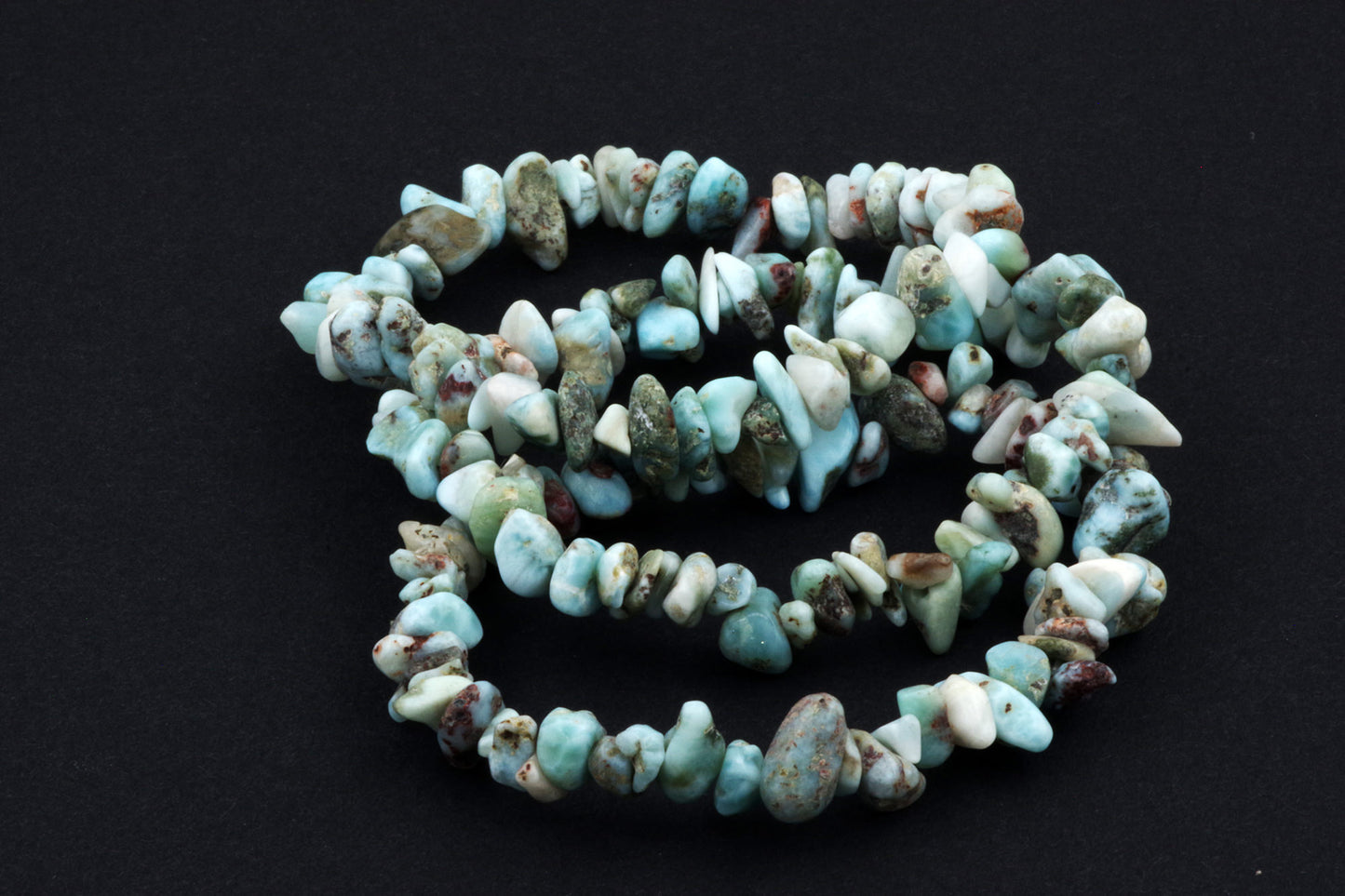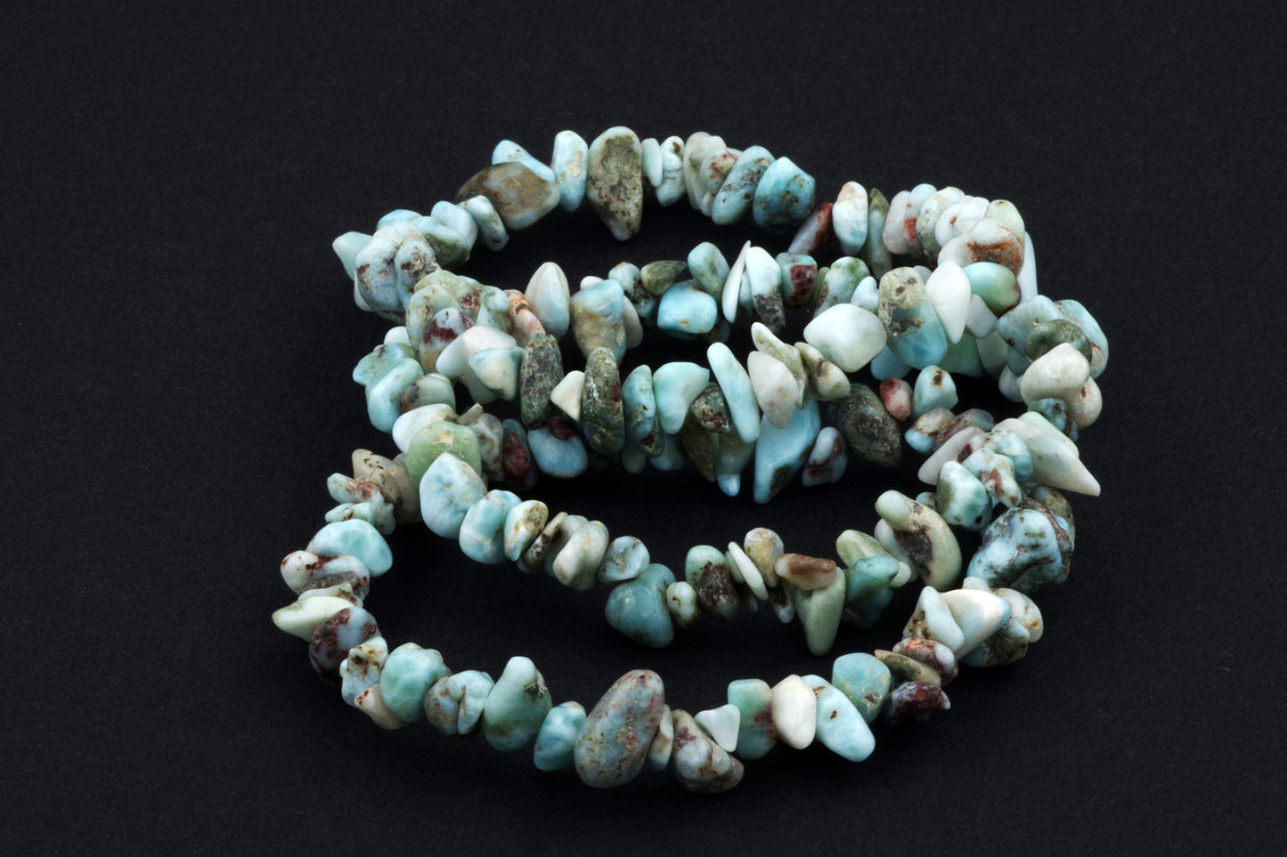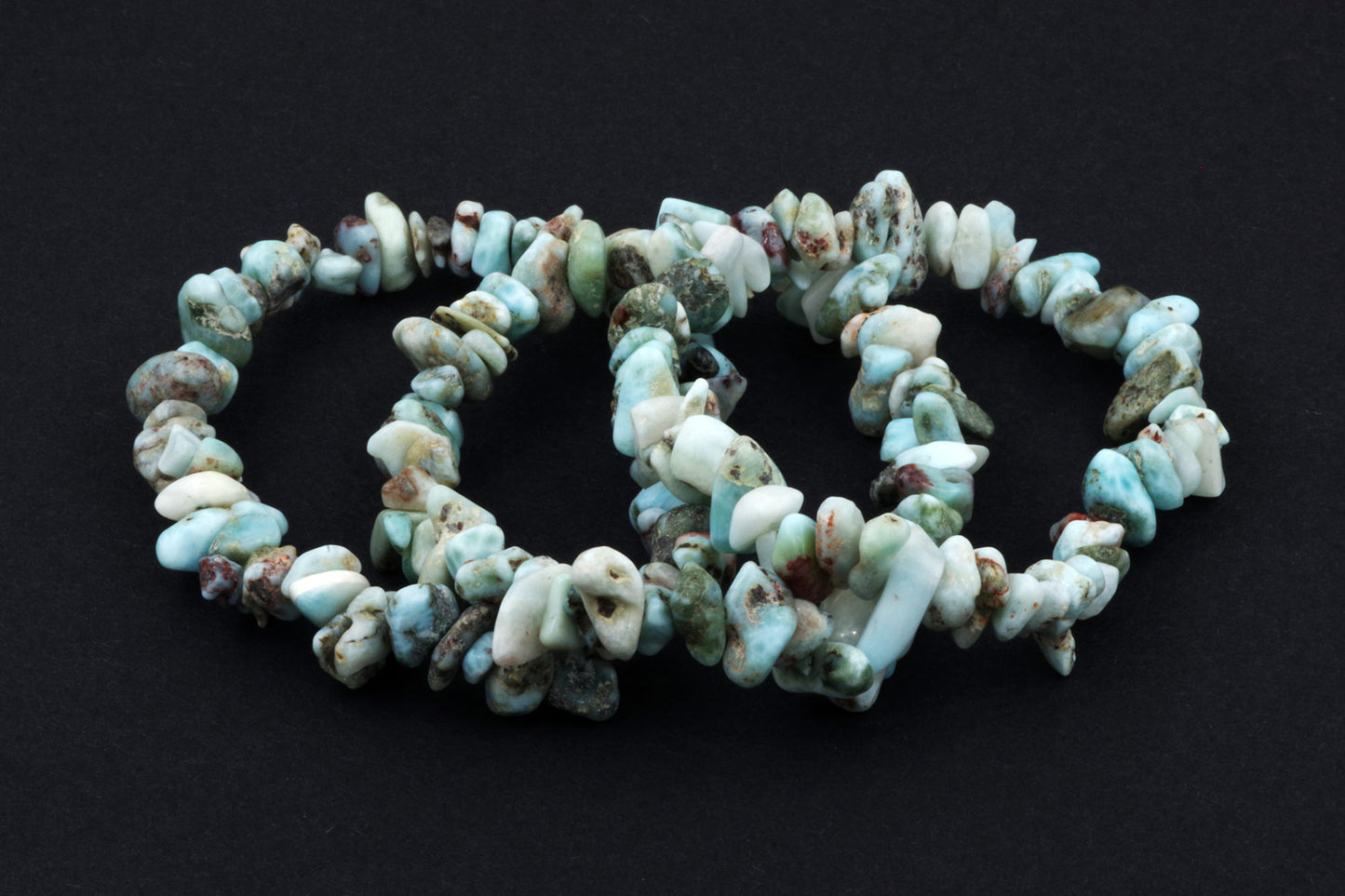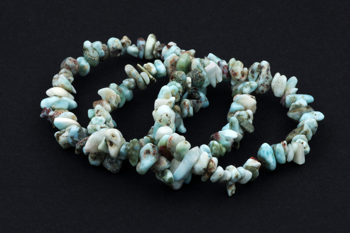 Style ludique "Chips" : Le bracelet est composé de petits chips de pierres de larimar, qui créent ensemble un effet visuel énergique et vivant.