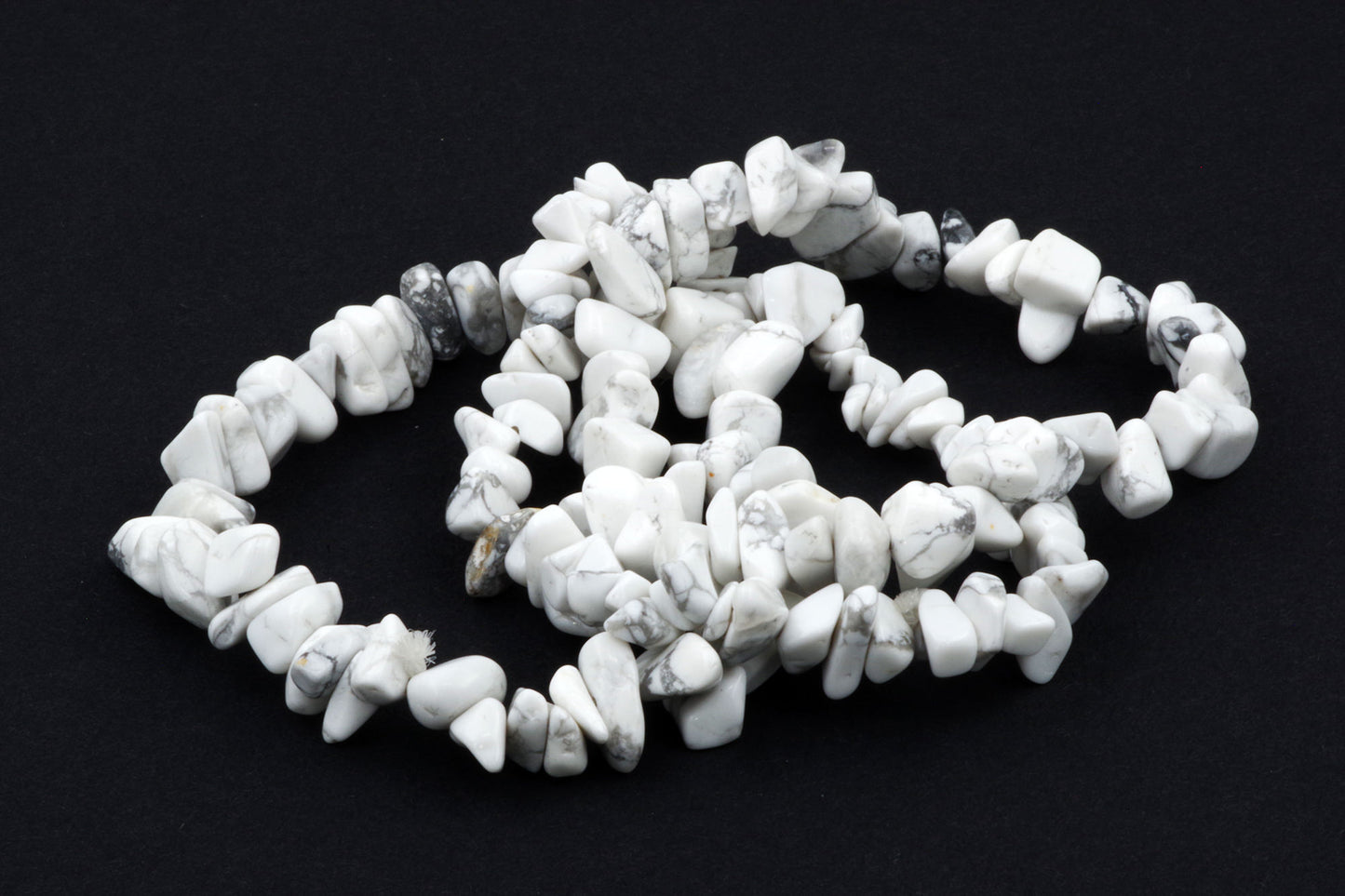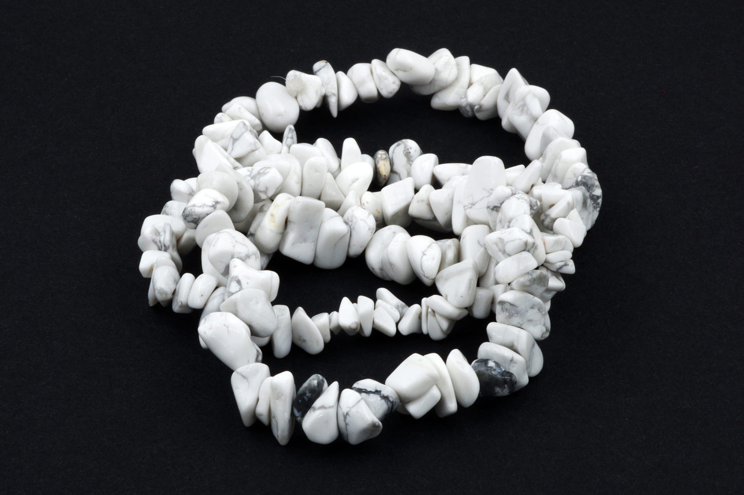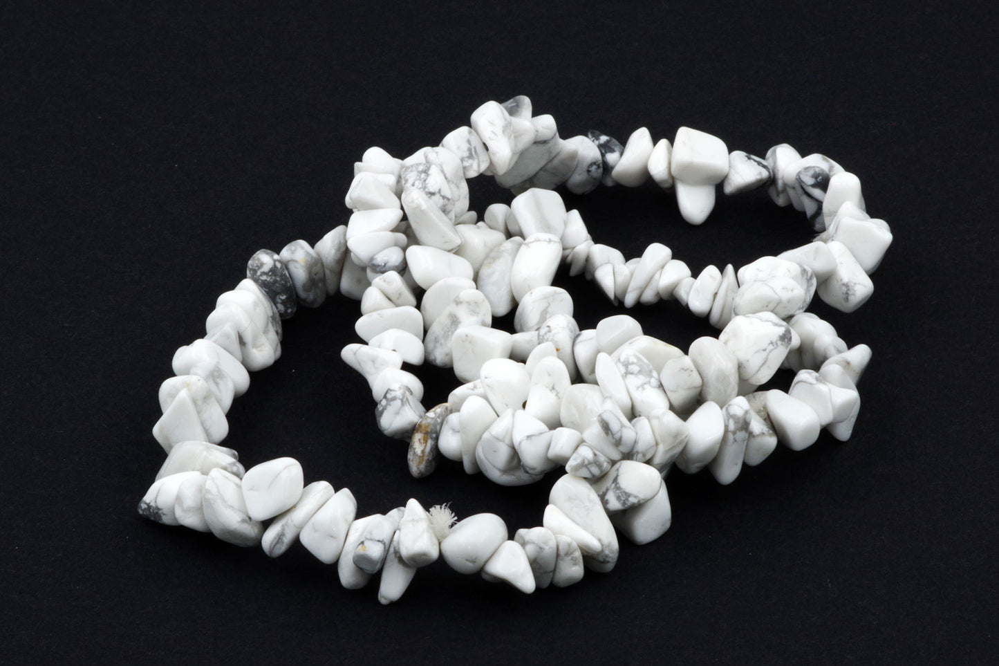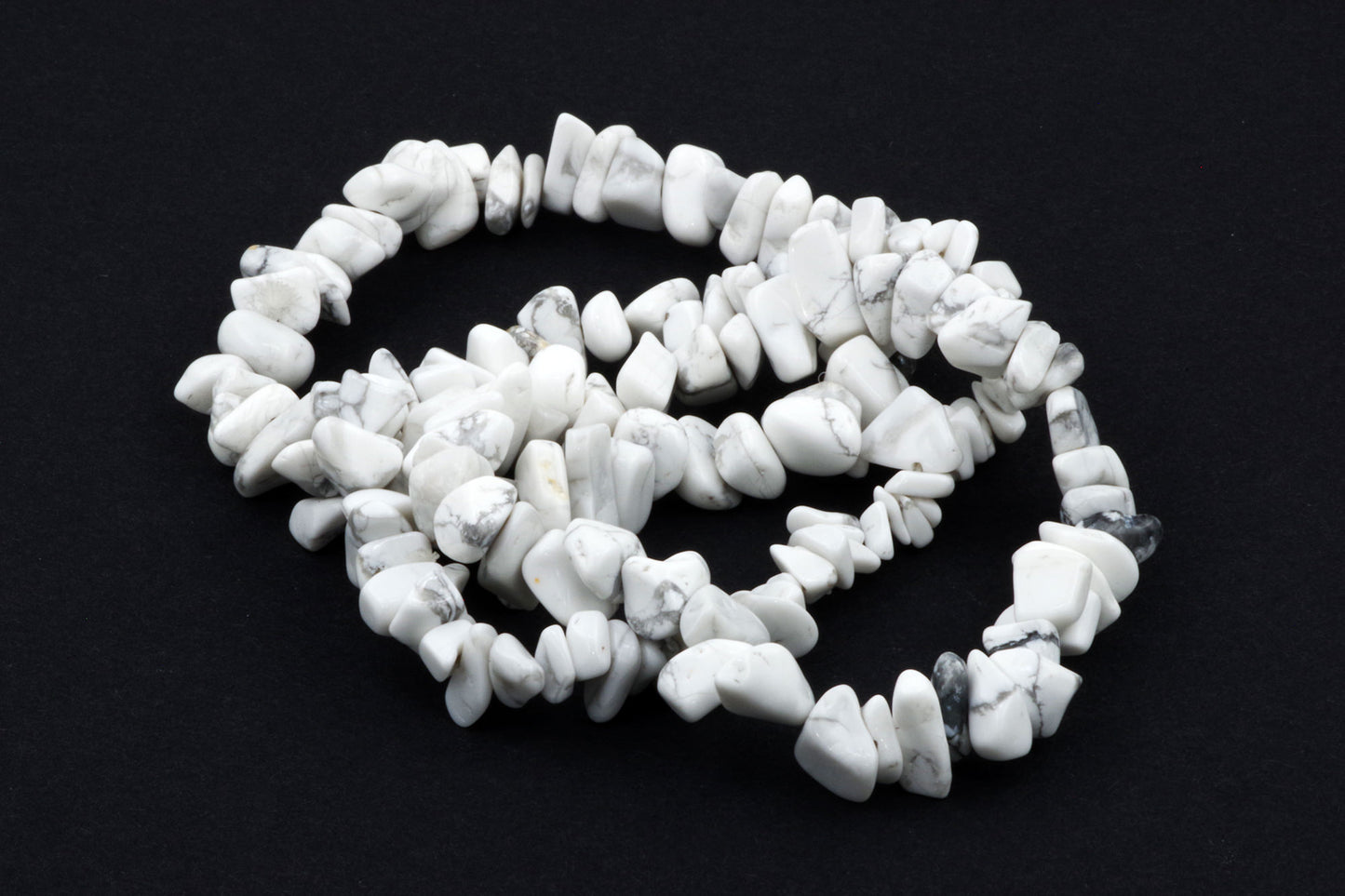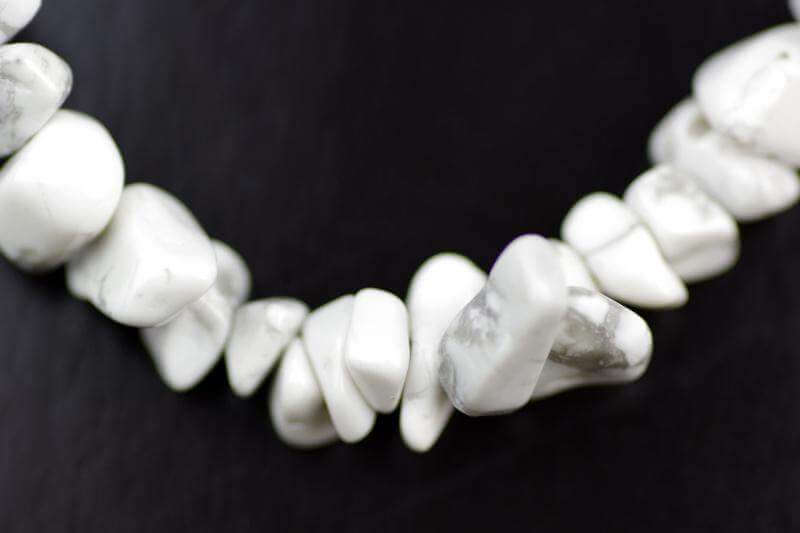 Ciottoli Irregolari: Ogni ciottolo di howlita a forma di chip – come un piccolo frammento misterioso – ha una sua texture e motivo unici, che insieme creano una sinfonia di bellezza casuale.