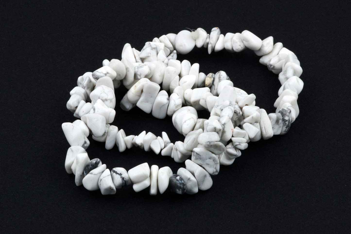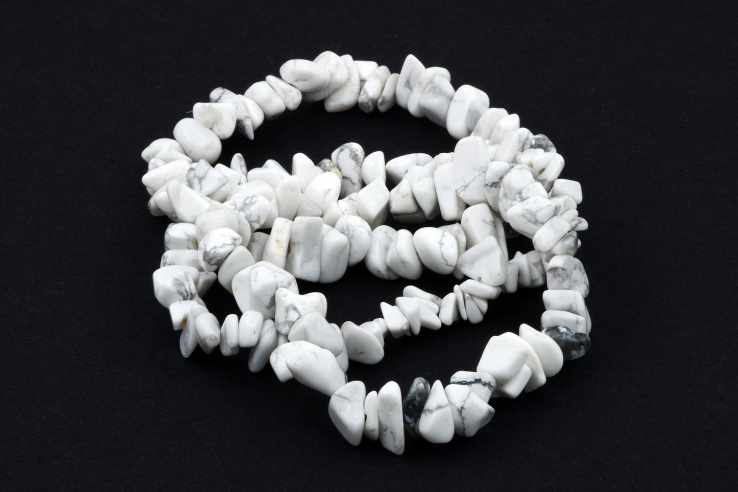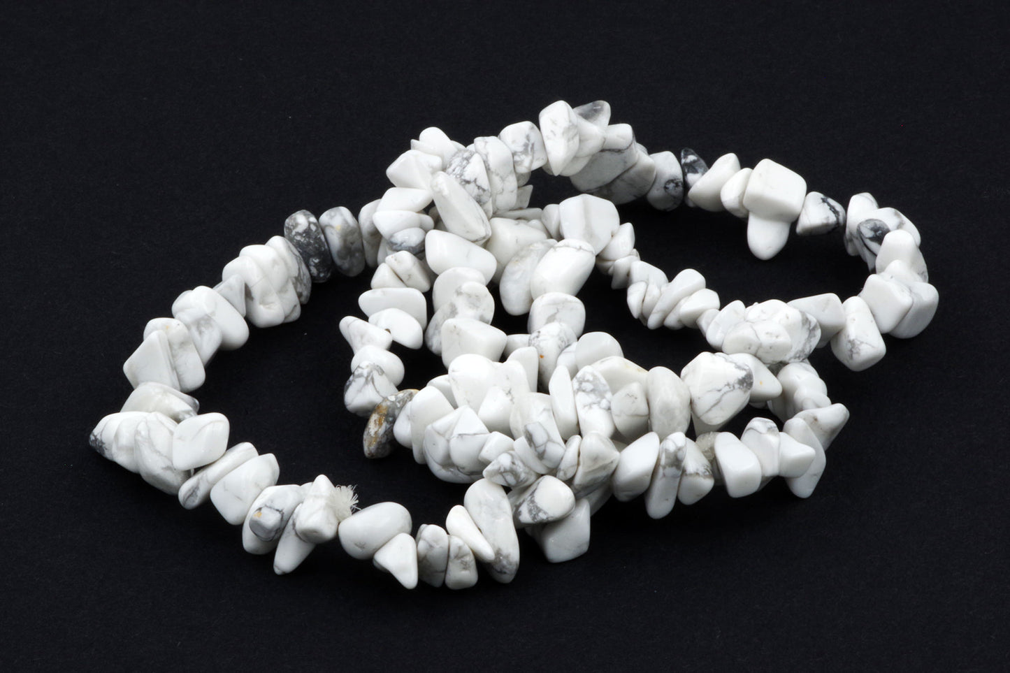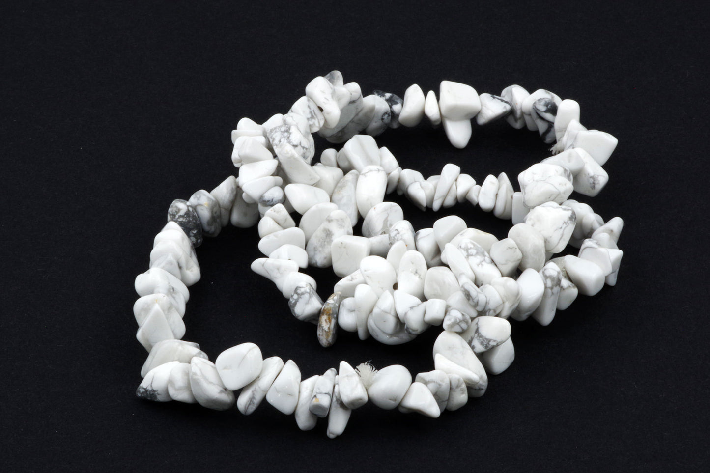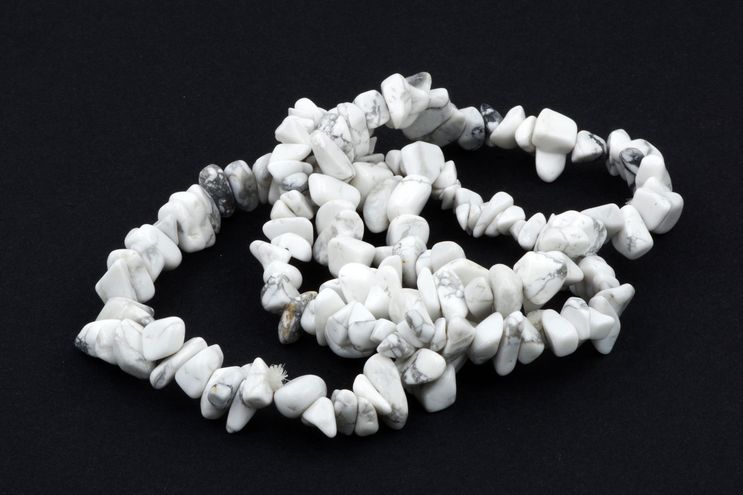 Ciottoli Irregolari: Ogni ciottolo di howlita a forma di chip – come un piccolo frammento misterioso – ha una sua texture e motivo unici, che insieme creano una sinfonia di bellezza casuale.