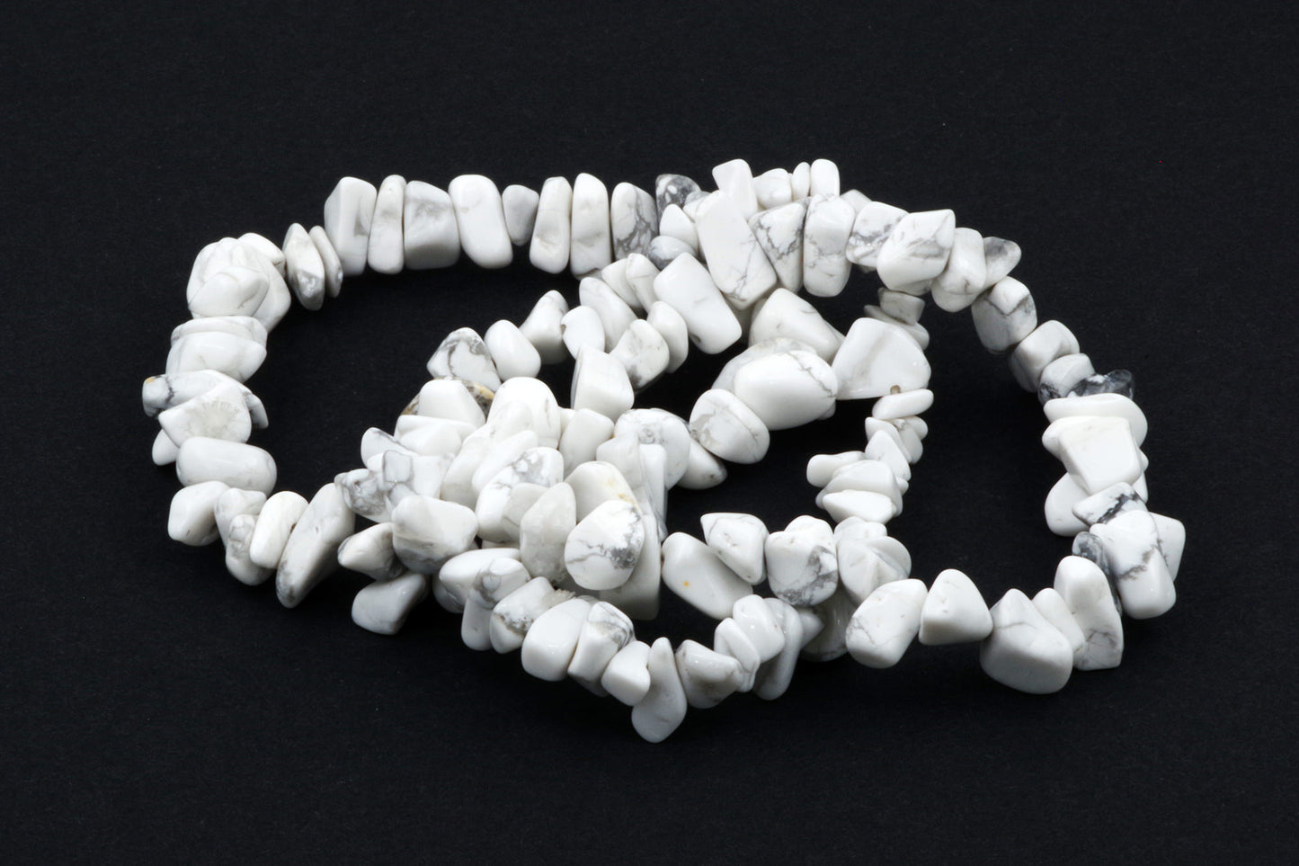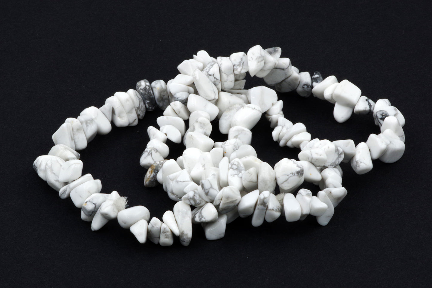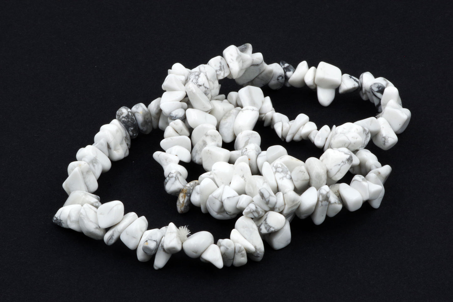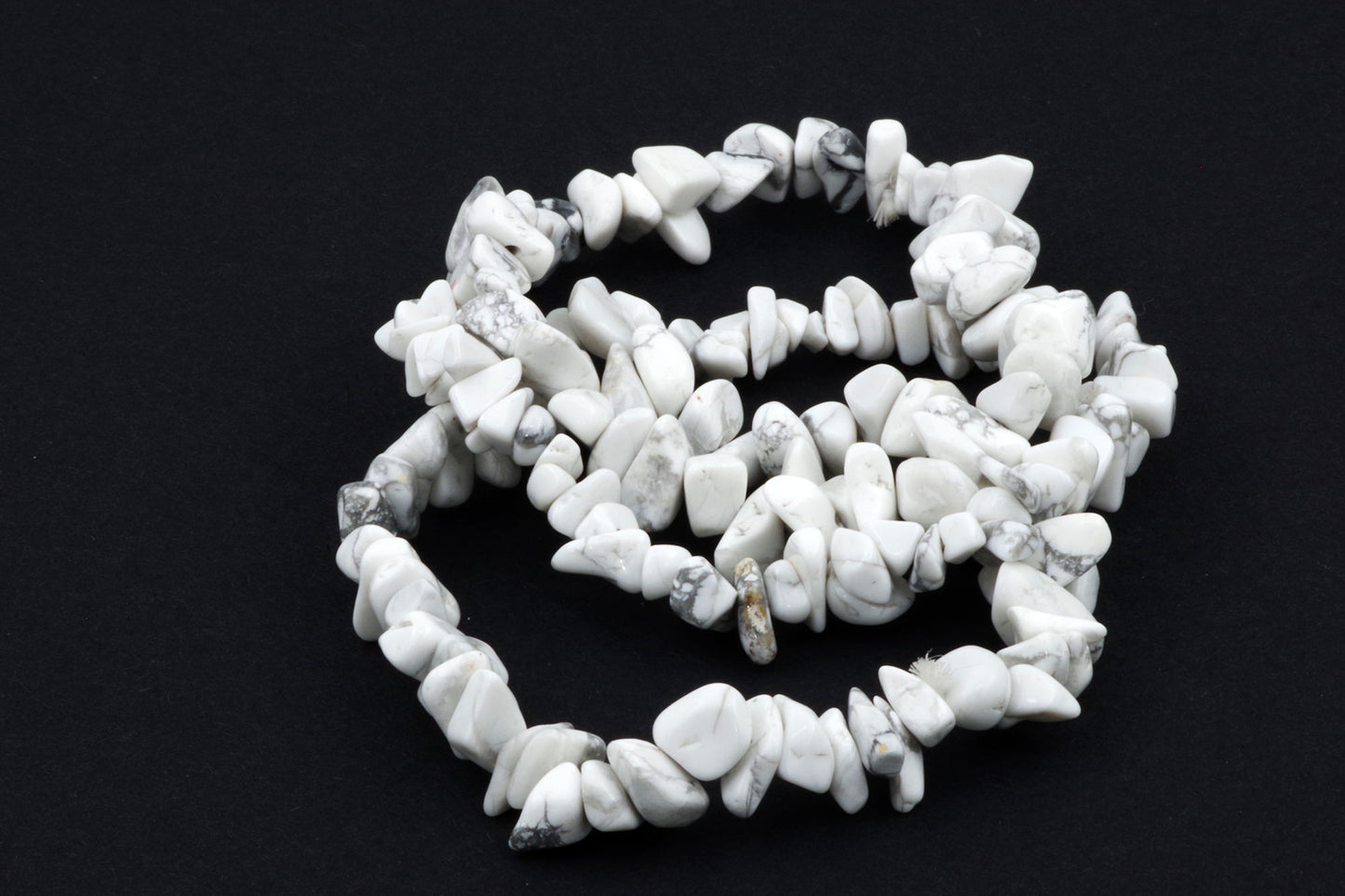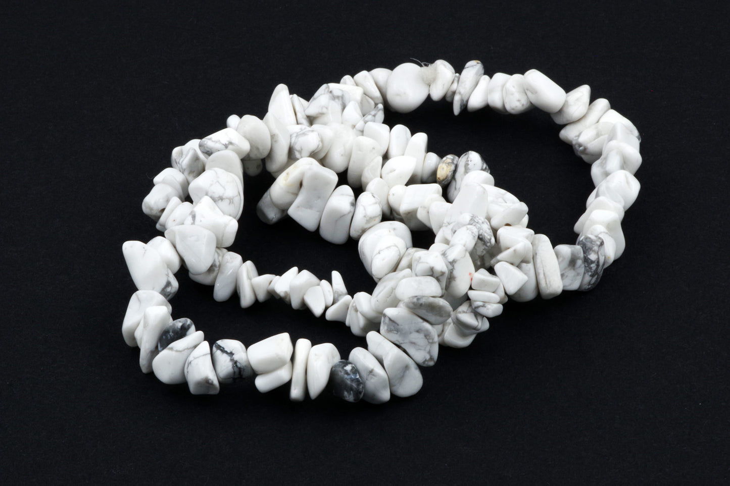 Ciottoli Irregolari: Ogni ciottolo di howlita a forma di chip – come un piccolo frammento misterioso – ha una sua texture e motivo unici, che insieme creano una sinfonia di bellezza casuale.