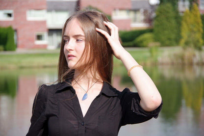- Pietra: Il quarzo blu, caratterizzato da profonde tonalità di blu e trasparenza, conferisce al ciondolo un fascino impressionante e rilassante.