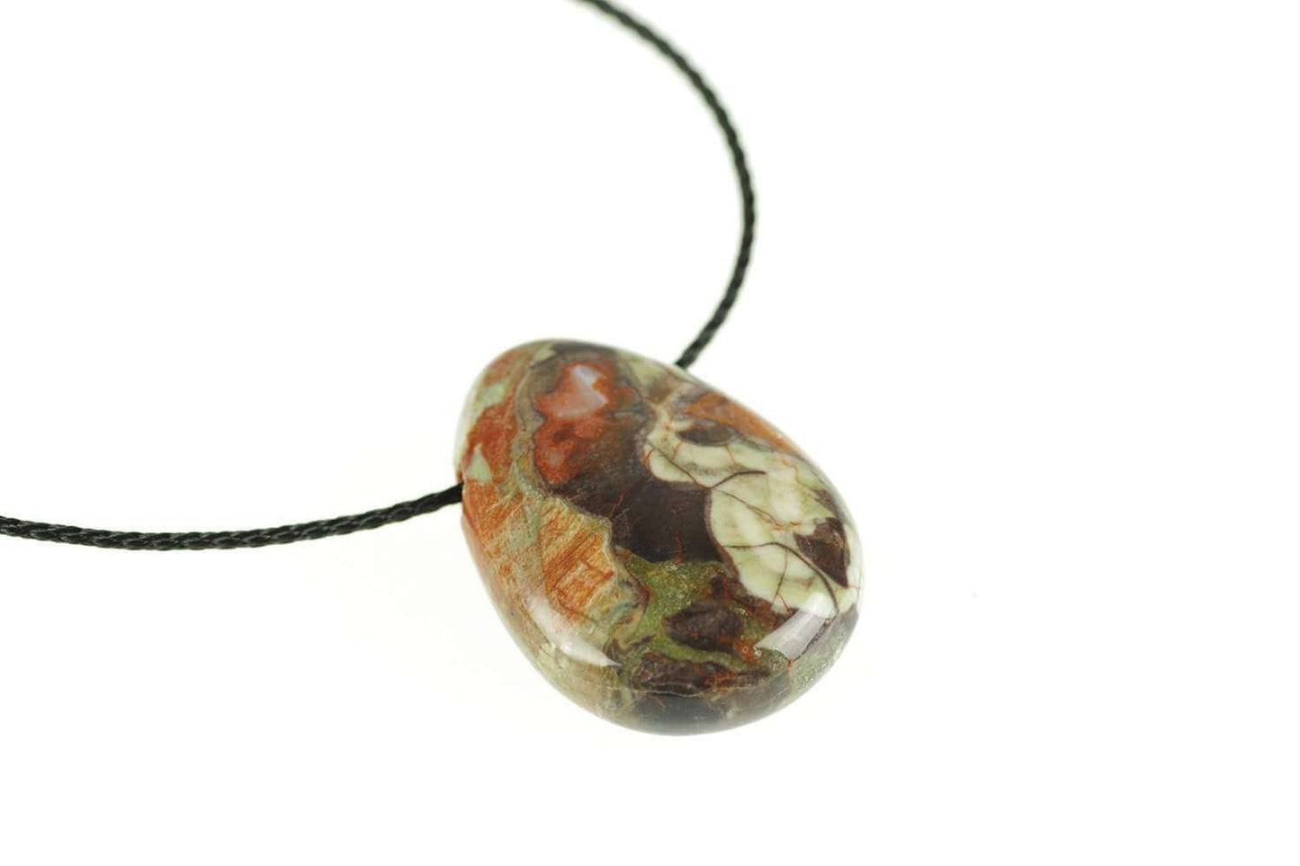 Gėlinis Riolitas: Akmens izceļas ar krāsainiem rakstiem, kas atgādina ziedu pļavu, piešķirot kulonam dabiskumu un dinamisku skaistumu.