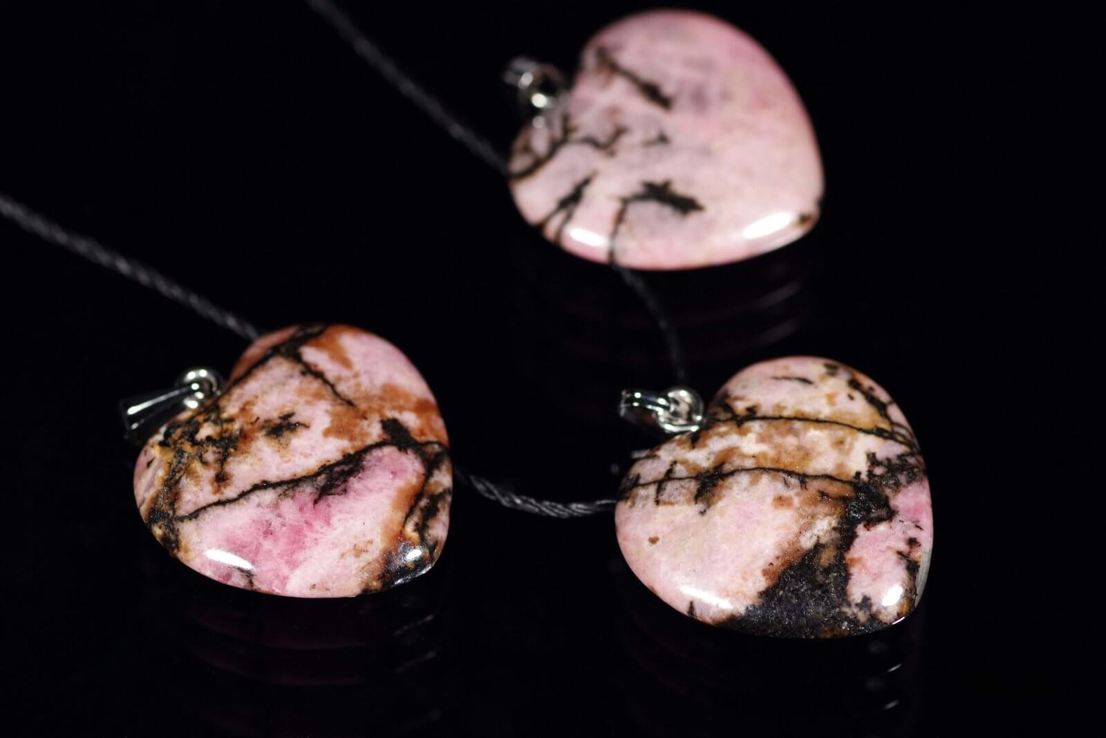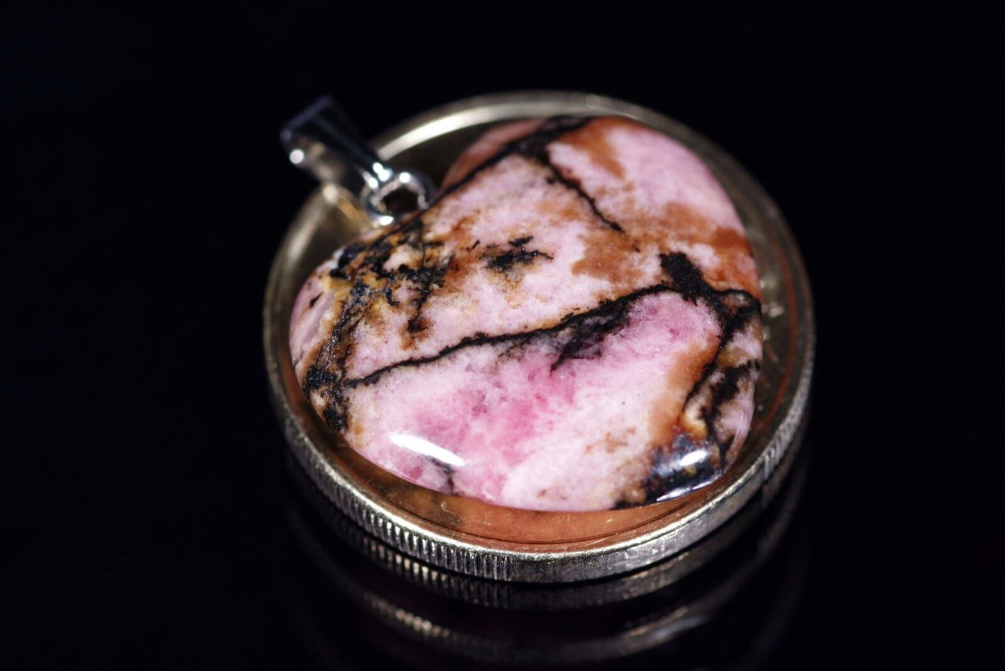 Akmens: Rodonīts izceļas ar bagātīgu rozā krāsu un skaistām rakstu formācijām, kas kulonam piešķir sirsnību un estētisku pievilcību.