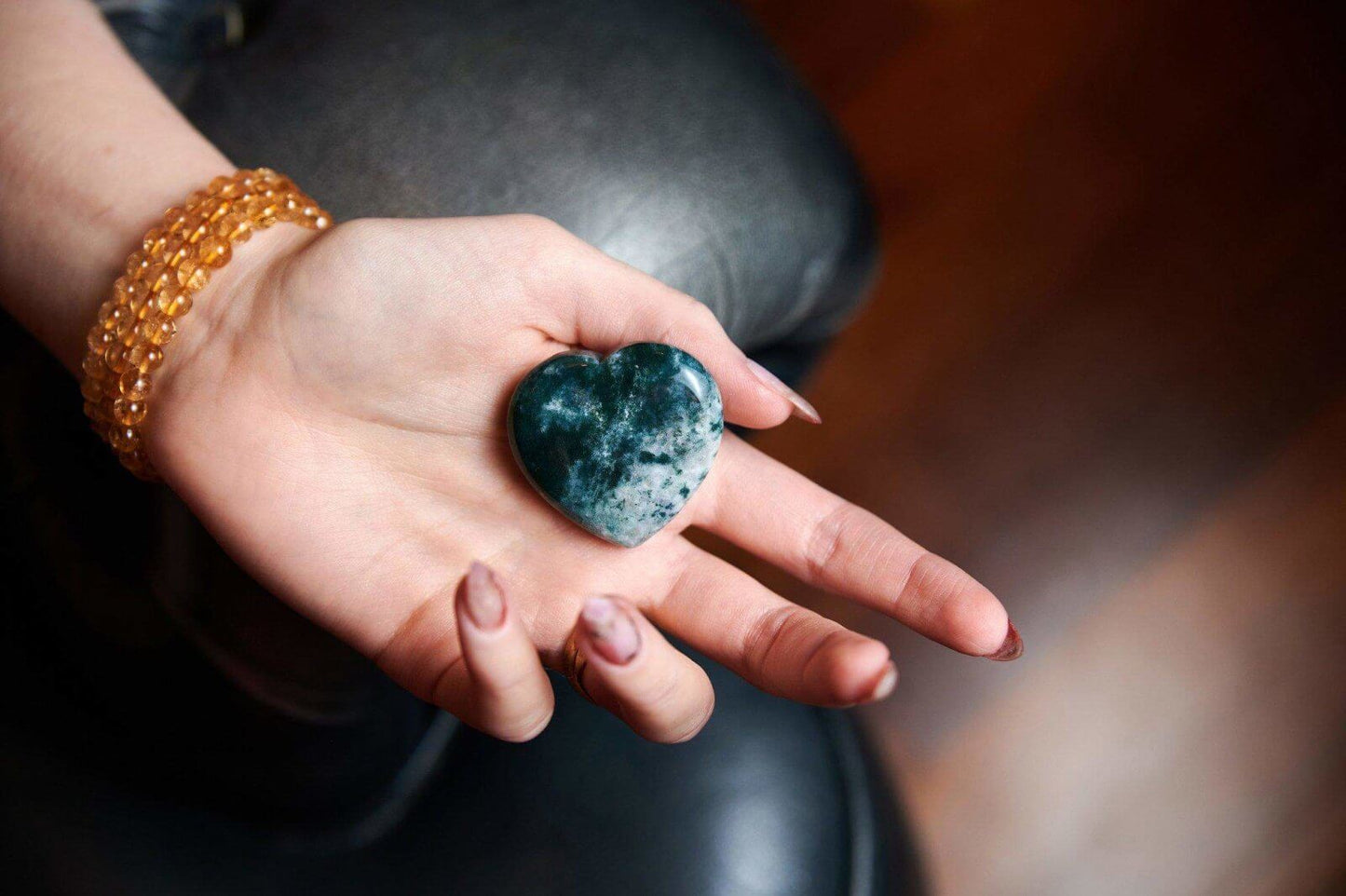 Sirds formas dizains: Akmens sirds forma simbolizē mīlestību, dzīvīgumu un harmoniju, piešķirot delnītei dziļu garīgu kontekstu.