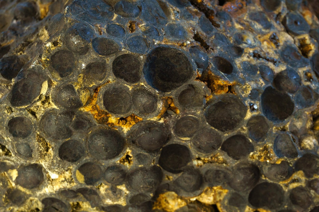 Bergart av ooider, sementert eller omdannet av jernoksider — samme geometriske struktur, annen kjemi, ofte dyp brun-rød farge.