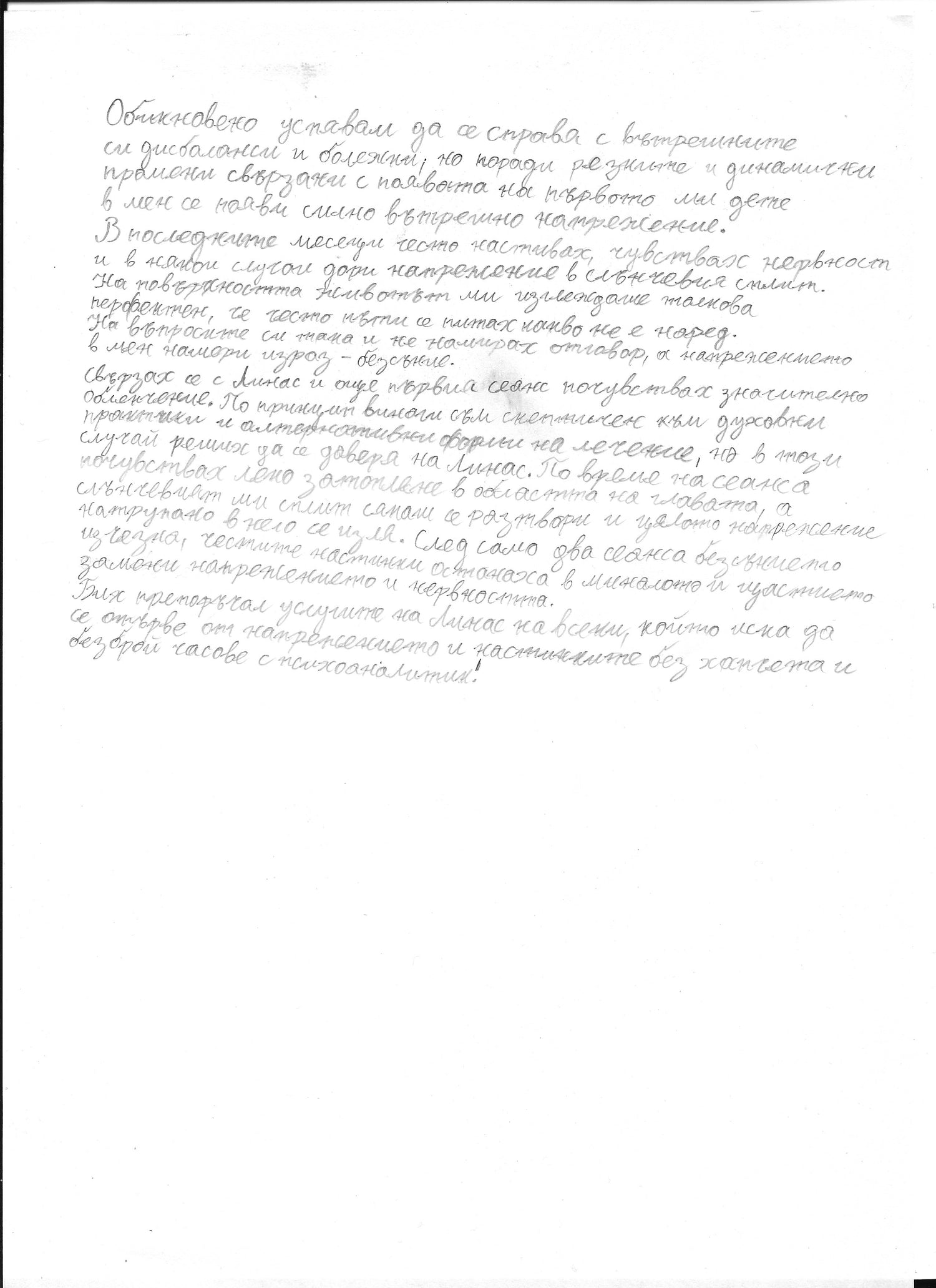 Susisiekiau su Linu, ir net pirmosios sesijos metu jaučiausi reikšmingai palengvėjęs. Apskritai visada skeptiškai vertinu dvasines praktikas ir alternatyvias gydymo formas, tačiau šiuo atveju nusprendžiau pasitikėti Liną. Sesijos metu jaučiau stiprius pulsavimus galvos srityje, o įtampa mano kūne ištirpo. Visa įtampa išnyko, o dažnos obsesinės mintys taip pat išnyko.