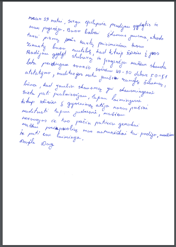 Emociniu lygiu buvau pripildytas teigiamų minčių. Nuoširdžiai dėkoju Linai už jos nuostabų darbą ir teikiamą pagalbą. Linkiu tau sveikatos ir tolesnės jėgos nuoširdžiai padėti žmonėms.