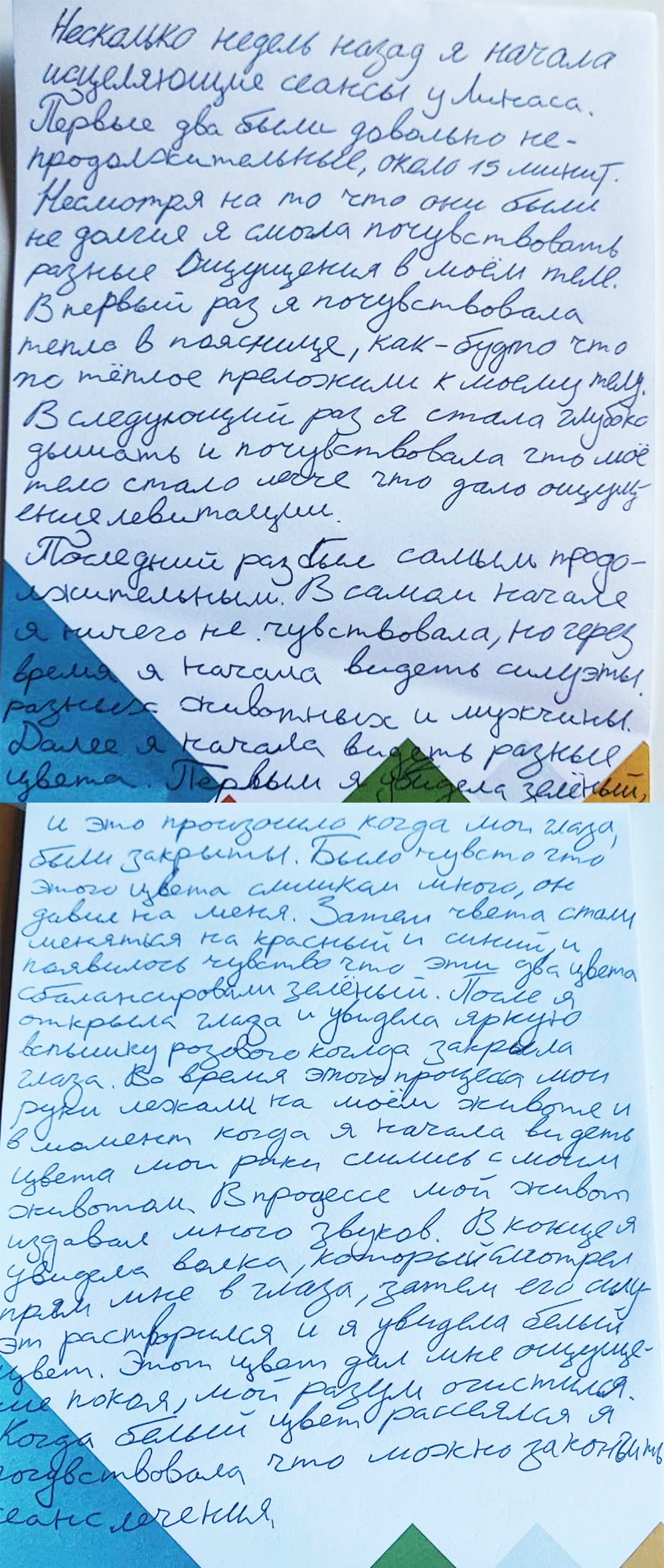 Paskutinė sesija buvo ilgiausia. Iš pradžių nejaučiau nieko, bet palaipsniui pradėjau matyti įvairius siluetus – žmogų ar skirtingus gyvūnus. Per procesą pradėjau matyti spalvas. Pirmoji buvo žalia, kai tik užmerkiau akis, jaučiausi tarsi perpilta šia spalva, kaip jos buvo per daug. Tada spalva pasikeitė į raudoną, vėliau mėlyną, ir atrodė, kad tos dvi spalvos subalansuoja žaliąją. Po to, kai vėl atsimerkiau ir užmerkiau akis, pamačiau rožinę 🩷 spalvą. Per šį procesą mano rankos leidosi ant skrandžio, ir tuo metu, kai pradėjau matyti tas spalvas, jaučiau, kad rankos susilieja su skrandžiu (kuris labai garsiai veikė).
