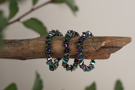 Tęczowy hematyt, zwany także „hematytem tytanowym” lub hematytem pokrytym osadami utlenionych metali, charakteryzuje się imponującym kolorowym połyskiem. Zazwyczaj jest to efekt powierzchniowy stworzony przez człowieka, polegający na pokryciu hematytu specjalnymi metalicznymi związkami nadającymi tęczowy blask. Wielu ceni go jako przyciągający wzrok dodatek noszony dla ochrony i wzmocnienia energetycznego.