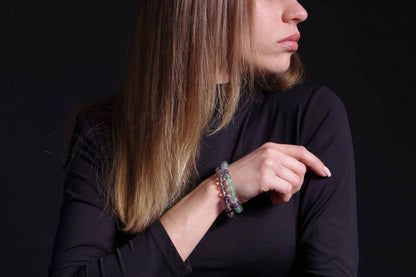 Odkryj ten wyjątkowy design bransoletki z fluorytem, który łączy naturalne piękno fluorytu z nowoczesnym stylem. Bransoletka wykonana z koralików fluorytowych o rozmiarze 8 mm charakteryzuje się dynamiczną różnorodnością kolorów – od delikatnej zieleni i niebieskiego po intensywny fiolet, którego intensywność zmienia się w zależności od oświetlenia. Ta kolorowa symfonia nadaje bransoletce unikalną atrakcyjność wizualną i wyjątkowość.