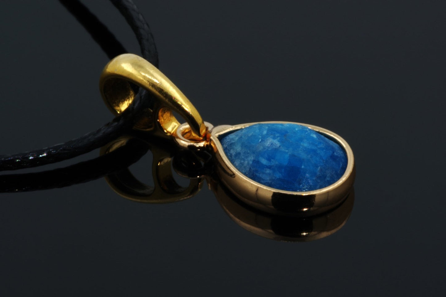 Tegul šis facetuotas apatito pakabukas "Lašas" su paauksuotu 925 sidabru tampa jūsų kasdienio įkvėpimo šaltiniu, skleidžiančiu vandens gilumą, dangaus platybių spindesį ir teigiamas vibracijas, kurios skatins asmeninį augimą ir kūrybiškumą.