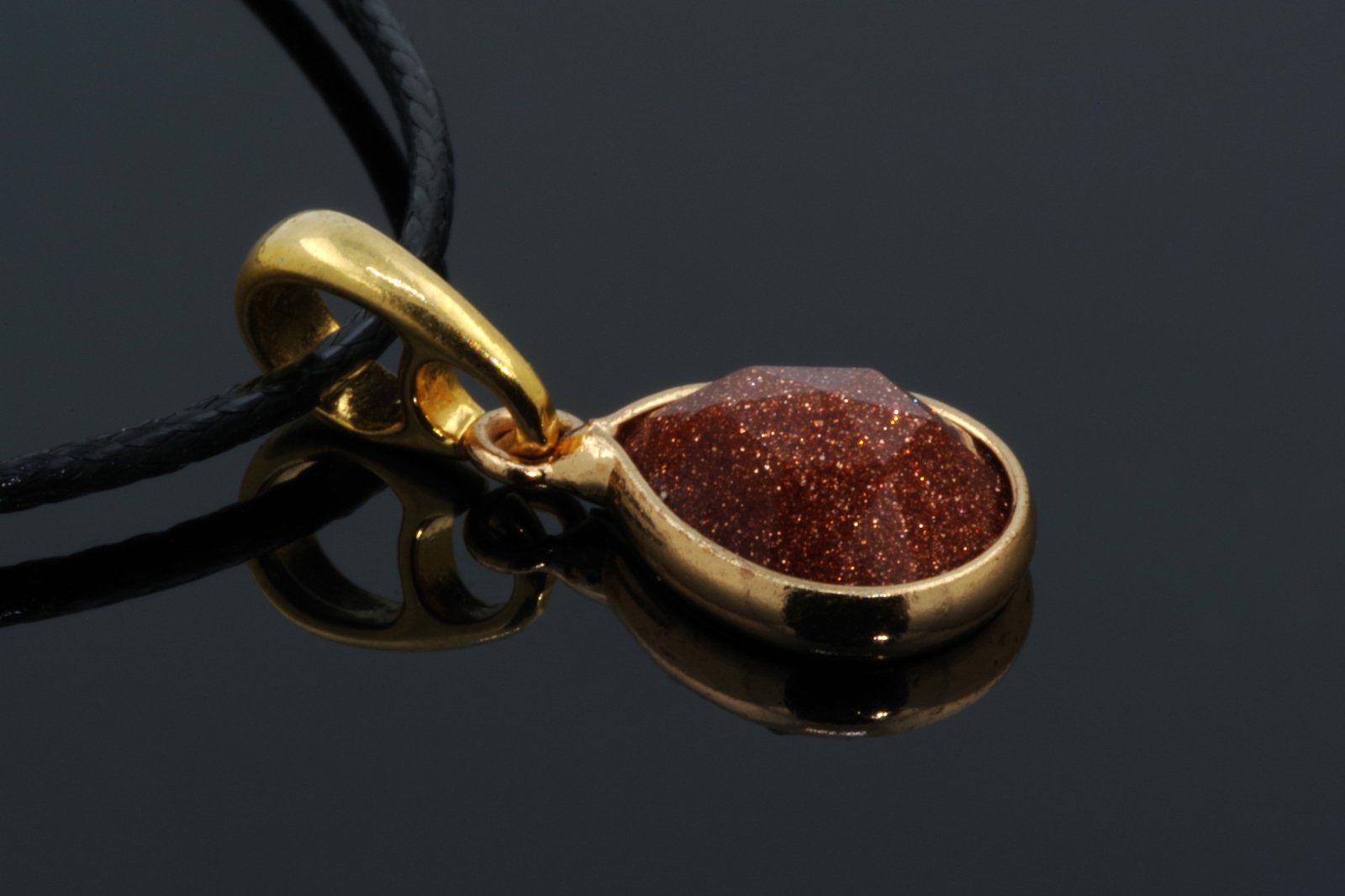 Atraskite aukso akmens pakabuką, kurio facetuota lašelio forma su paauksuotu 925 prabos sidabru iškart traukia dėmesį. Šis elegantiškas aksesuaras žiba tarsi maža, bet ryški visatos dalis, įkapsuliuota į papuošalą, kuris primena tamsioje nakties danguje žvaigždžių šviesą.