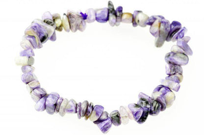 Nevienodos Formos Akmenėliai: Čipsiukų formos čaroito akmenėliai suteikia apyrankės dizainui unikalumo ir atsitiktinio grožio, pabrėždami mineralo natūralumą.