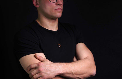 Geležinė Tigro Akis: Akmuo išsiskiria savo gilios bronzos spalvos atspalviais ir charakteringais raštais, suteikdamas pakabukui gyvybingumo ir stiprybės.