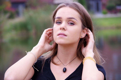 - Juodasis Oniksas: Giliai juoda spalva ir natūralus blizgesys atskleidžia paslaptingą onikso jėgą, suteikdami pakabukui elegancijos ir vidinį stabilumą.