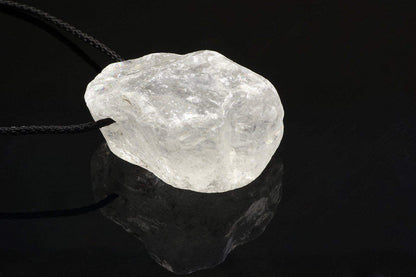 Forma: Natūralus, neapdirbtas kalnų krištolo gabalas, kurio forma ir tekstūra suteikia kiekvienam pakabukui unikalumą ir asmeniškumą.