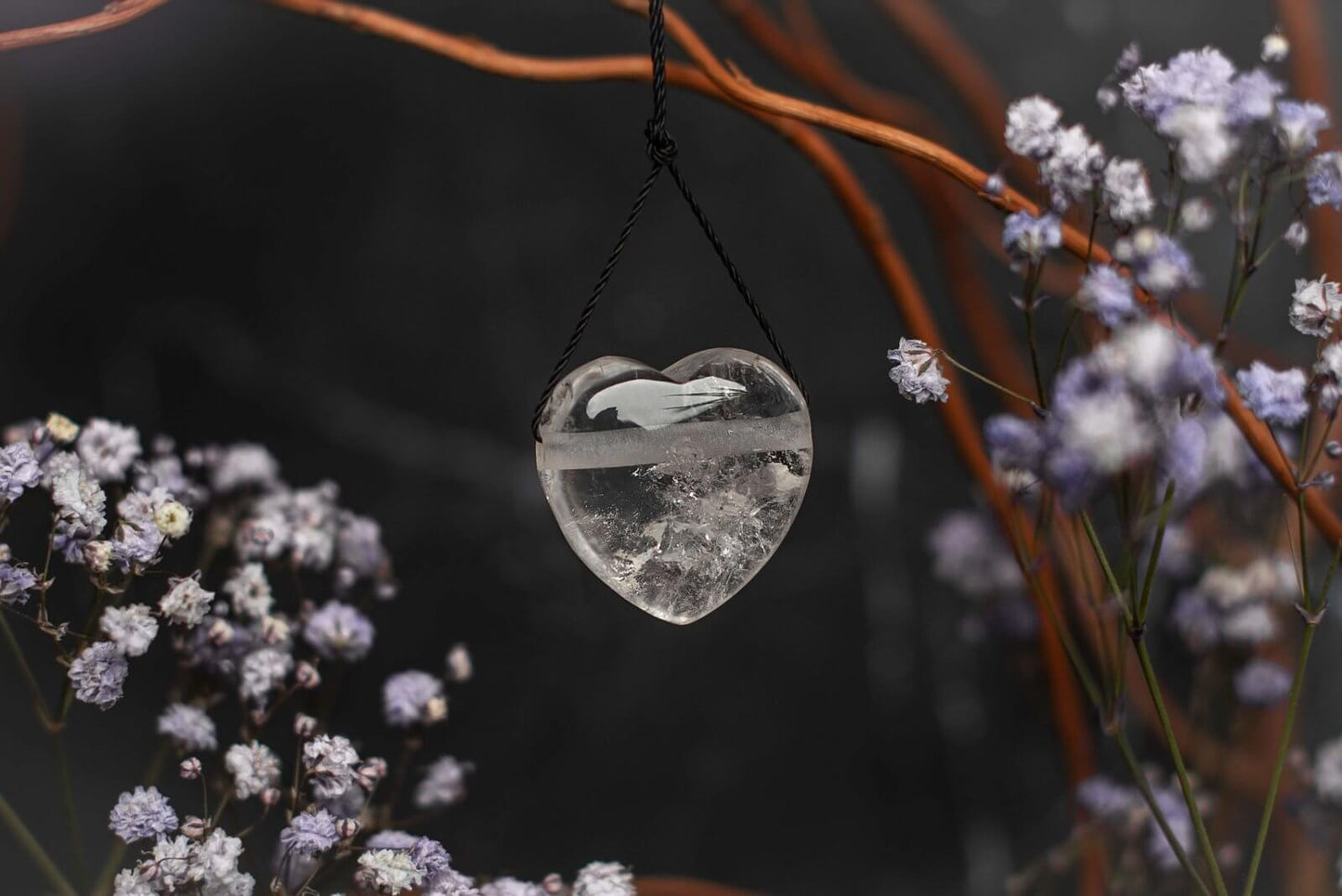 Subtilus Dizainas: Kruopščiai suformuota širdutės forma išryškina kalnų krištolo natūralų žaismą ir spalvų švelnumą, suteikdama aksesuarui unikalų charakterį.