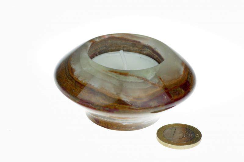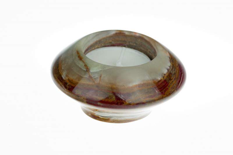 Šio unikalaus dizaino žvakidė pasižymi futuristiniu NSO formos sprendimu, kuris perteikia mįslingą ir modernų požiūrį į interjero dekoravimą. Jos inovatyvi forma ir natūralus onikso akmens grožis suteikia dinamišką vizualinį efektą, kuris puikiai dera tiek šiuolaikiškuose, tiek tradiciniuose interjeruose. Kruopščiai išdirbtos detalės atskleidžia akmens unikalią tekstūrą ir prideda jūsų erdvei originalumo.