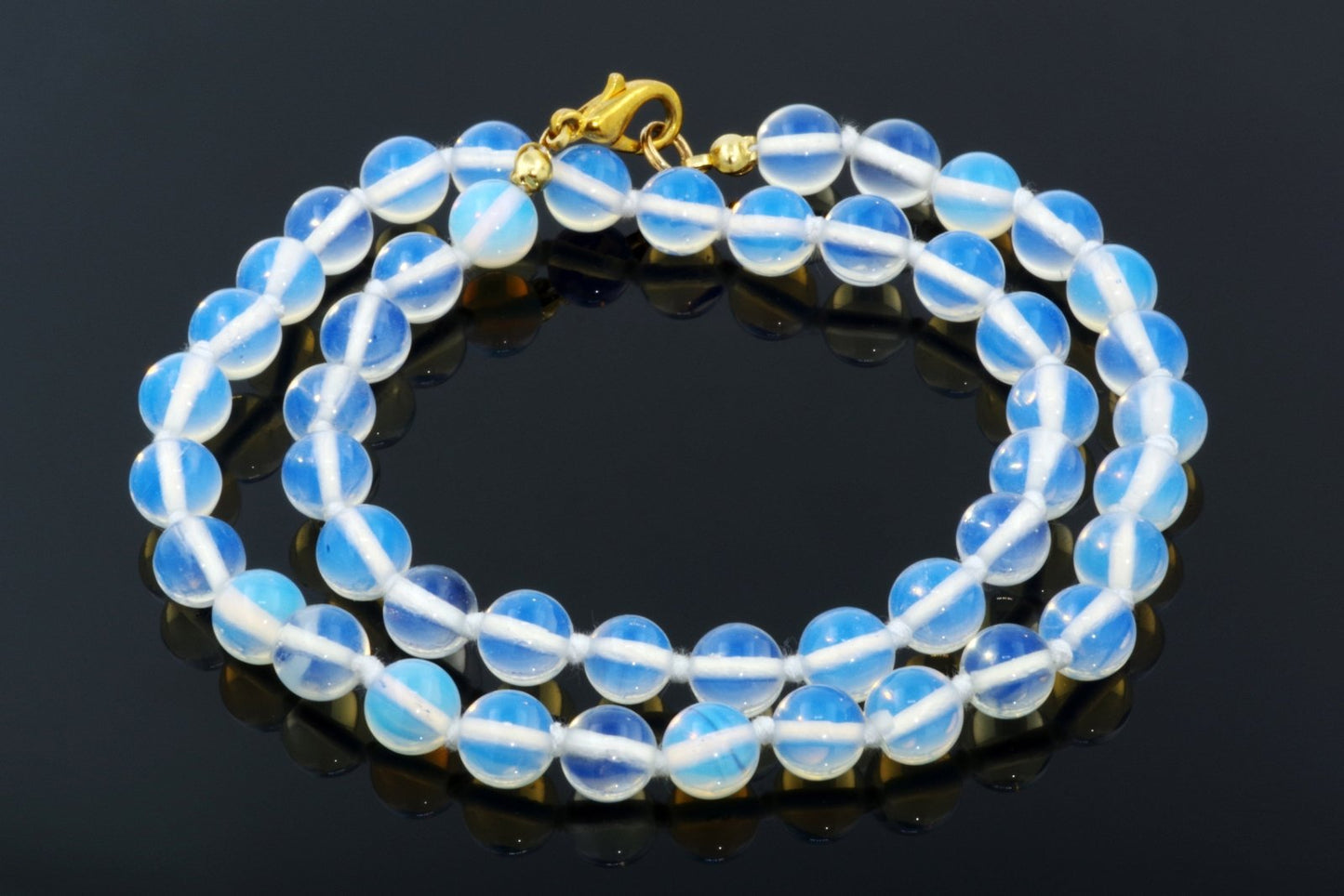 Opalitas, nors ir dirbtinai sukurtas akmuo, pasižymi ypatingomis savybėmis, kurios skatina vidinę ramybę ir aiškumą. Jis siejamas su emocijų išraiška, padeda atsiverti naujiems pokyčiams ir stiprina kūrybinę energiją. Dėl šių savybių, karoliai tampa ne tik stilingu papuošalu, bet ir simboliniu talismanu, įkvepiančiu pozityvų mąstymą bei dvasinį augimą.