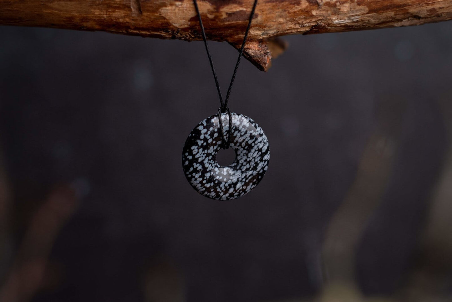 Akmuo: Snieginis obsidianas, žinomas dėl savo tamsios spalvos su baltais įtraukiais, suteikia pakabukui mistinio žavesio ir gilumo.