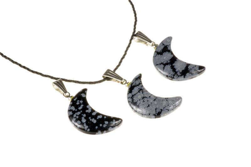 Atraskite mistinį ir simbolinį papuošalą, kuriame snieginis obsidianas, suformuotas į mėnulio formą, perteikia mėnulio mistiką, intuiciją bei transformaciją. Tamsus fonas su baltais įtraukiais, primenančiais sniegą, suteikia pakabukui gilų estetinį patrauklumą.