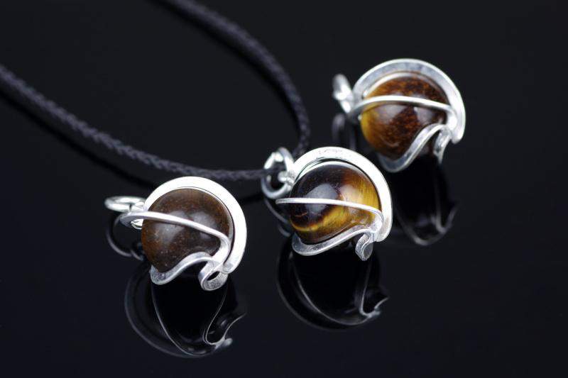 Akmuo: Tigro akis, išsiskiriantis ryškia geltonai-ruda spalva ir žvilgančiais raštais, suteikia pakabukui gilumo ir išraiškingumo.
