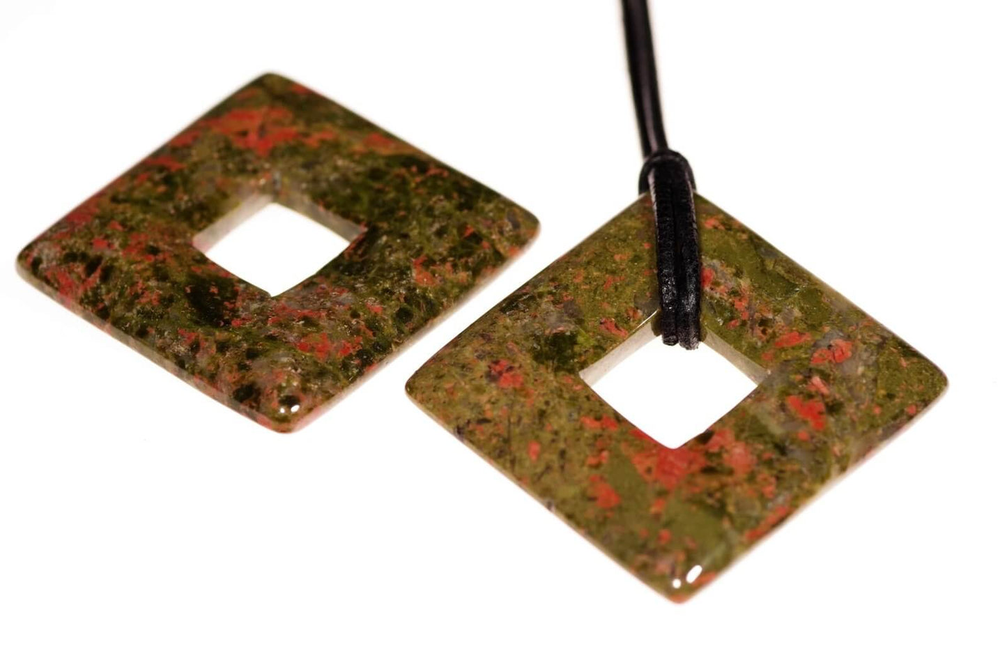 - Forma: Rombas, 28 mm dydžio, puikiai išryškina unakito akmens natūralų grožį ir yra subtilus, tačiau išraiškingas pasirinkimas.