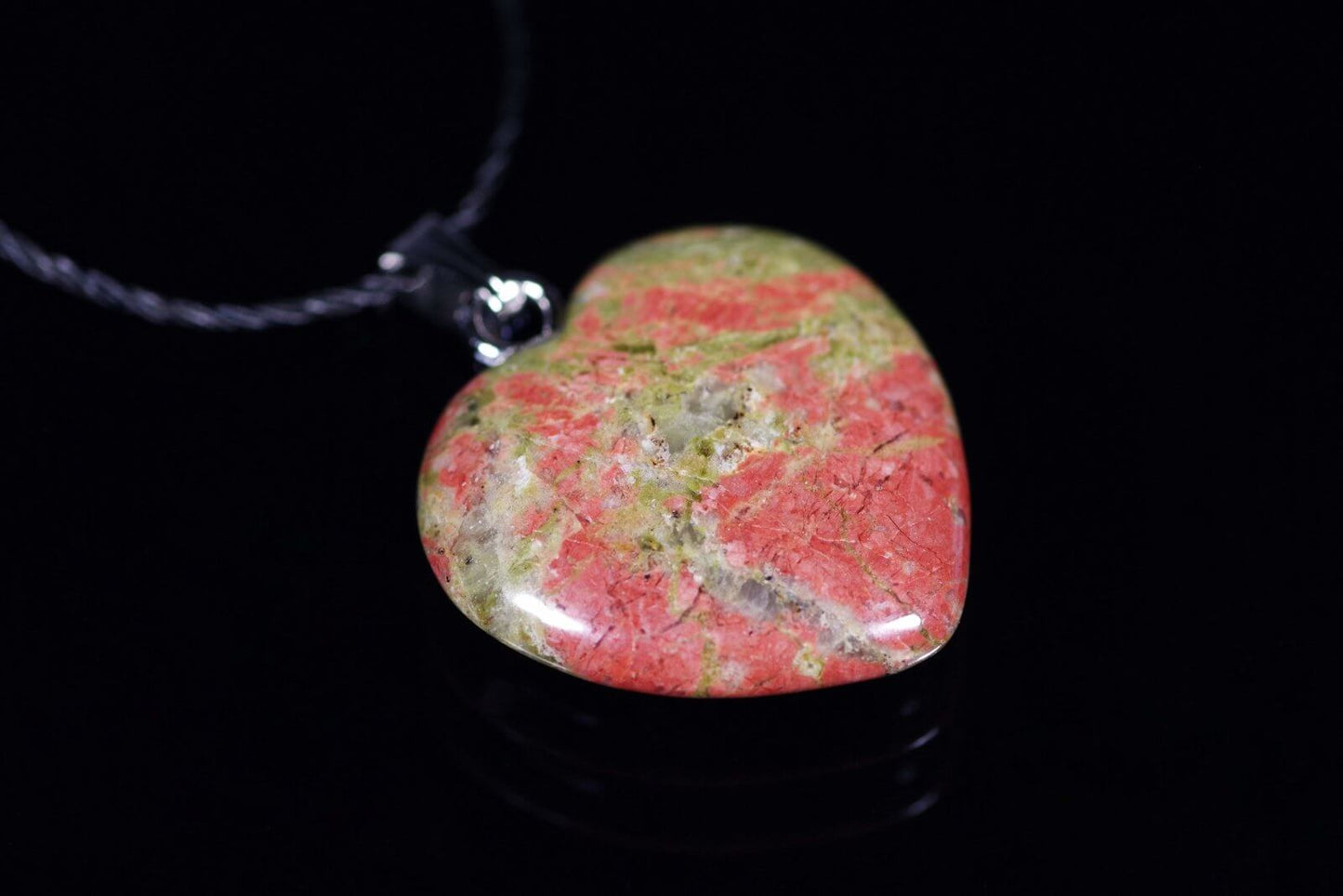 Atraskite švelnų ir žavingą papuošalą, kuriame dominuoja mažo dydžio unakito akmuo, suformuotas į elegantišką širdutės formą. Šis unakitas, pasižymintis sodria žalios spalvos deriniu, papildytu rožinėmis ar raudonomis įtraukomis, suteikia pakabukui ne tik išskirtinį estetinį patrauklumą, bet ir simbolizuoja meilę, pusiausvyrą bei dvasinę ramybę.