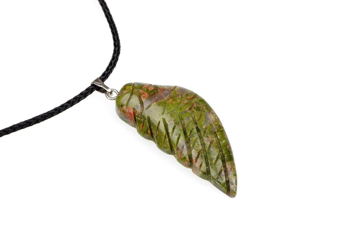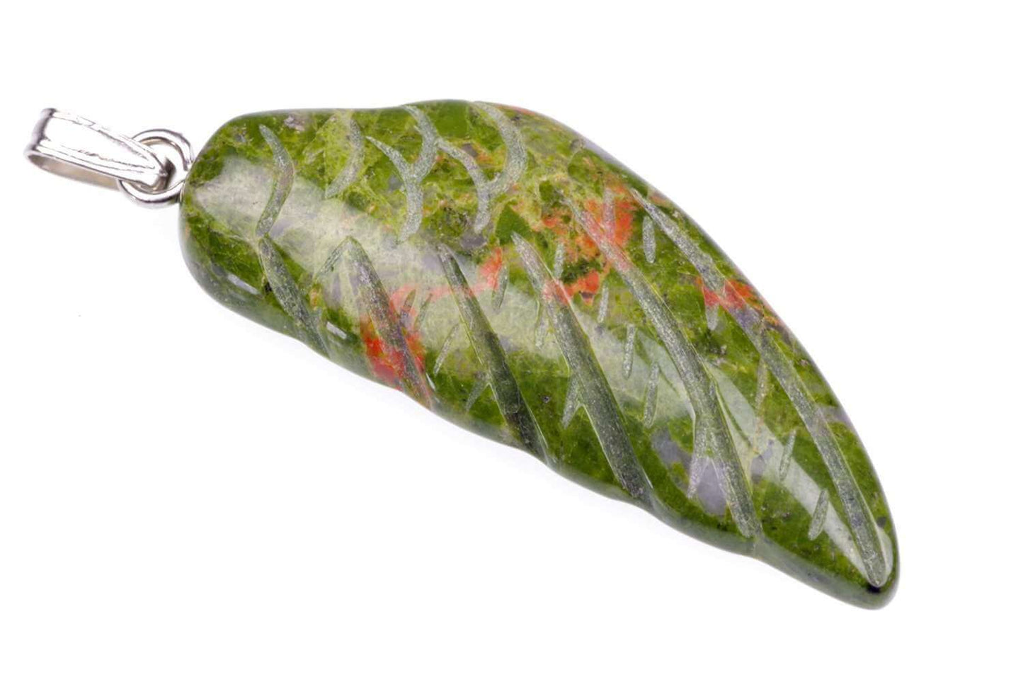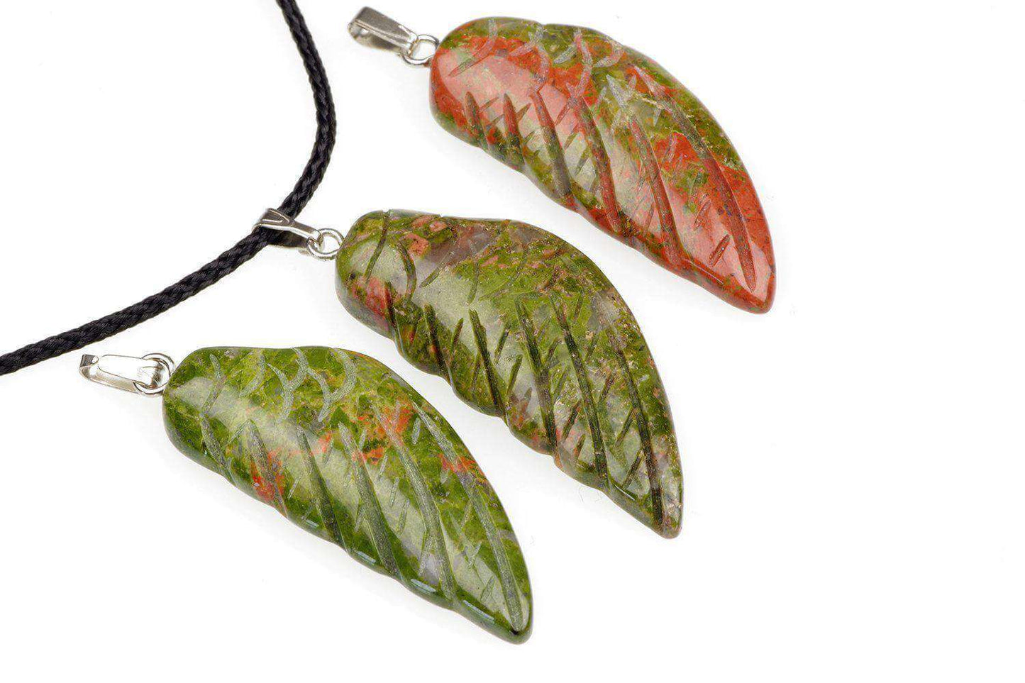 Atraskite išskirtinį ir simbolinį papuošalą, kuriame pagrindinis elementas – unakito akmuo, suformuotas į sparno formą. Unakitas, garsėjantis savo sodria žalia spalva, papildyta rožinėmis ar raudonomis įtaigomis, suteikia pakabukui ne tik estetinį patrauklumą, bet ir simbolizuoja laisvę, kūrybiškumą bei dvasinę pakylėjimą.