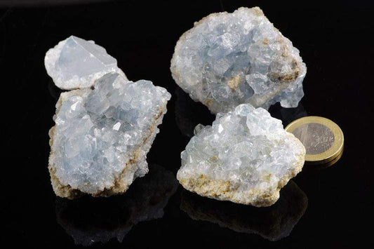 Celestin är en ljusblå eller vitaktig mineral med sköra, oftast prismatiska kristaller. Dess namn kommer från det latinska ordet "caelestis", som betyder "himmelsk". Denna association till himlen syftar på mineralets färg och dess lätta, "eteriska" intryck. Inom esoteriken anses celestin vara en själsroare som hjälper till att hitta känslomässig balans, särskilt under oroliga tider. På grund av sin subtila blåhet är den omtyckt av samlare och inredningsentusiaster, och ger rummet en himmelsk charm.