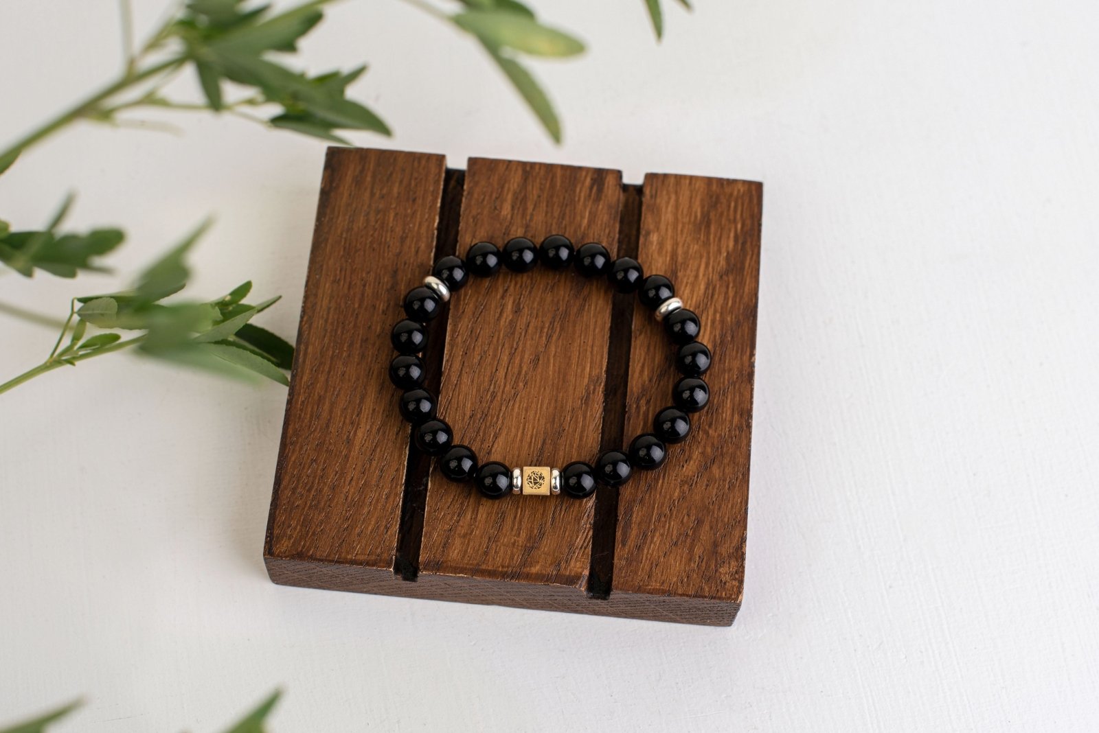 Låt urgamla hemligheter tränga in i din själ med denna magiska talisman – ett svart onyx-armband där varje 8 mm stor pärla, kombinerad med 925 silverdetaljer, bär på ljuset från uråldrig visdom. Det inspirerar styrka och skydd och bjuder in dig till en djupare andlig resa.