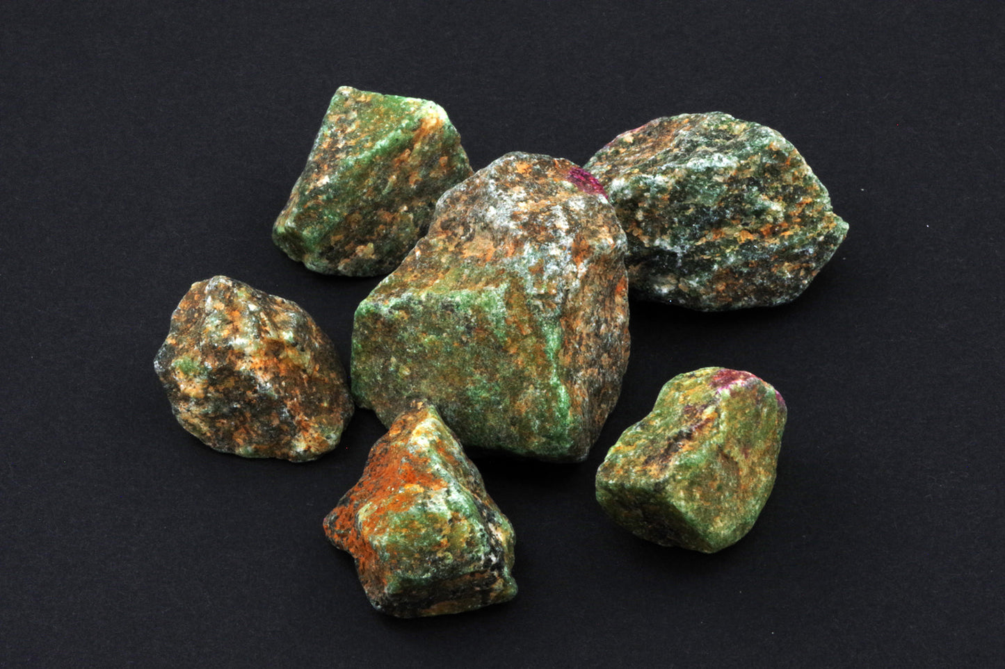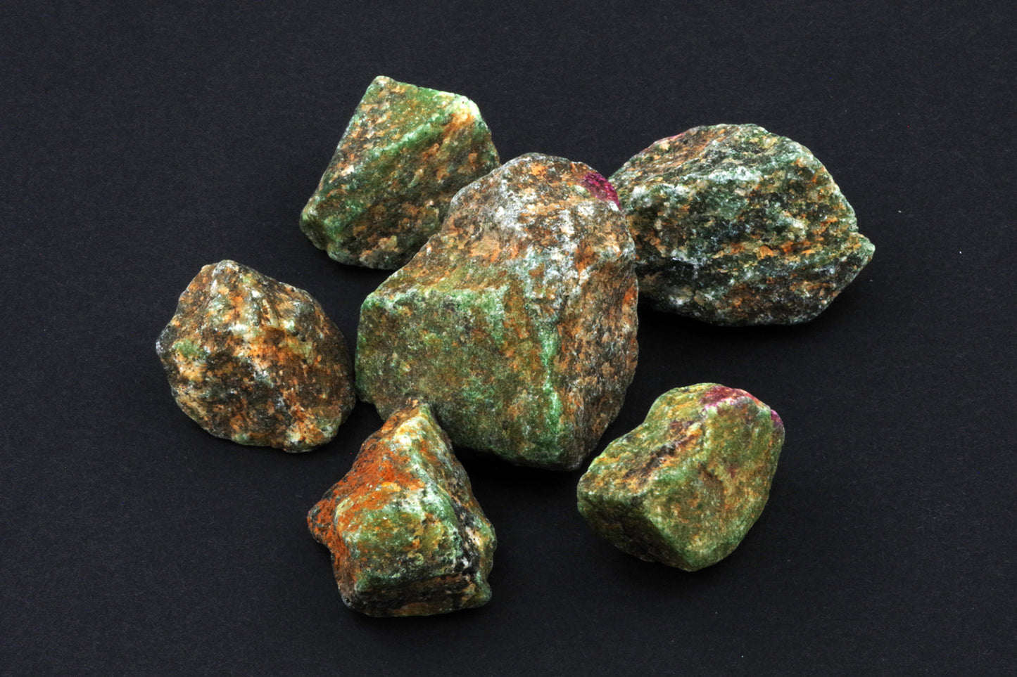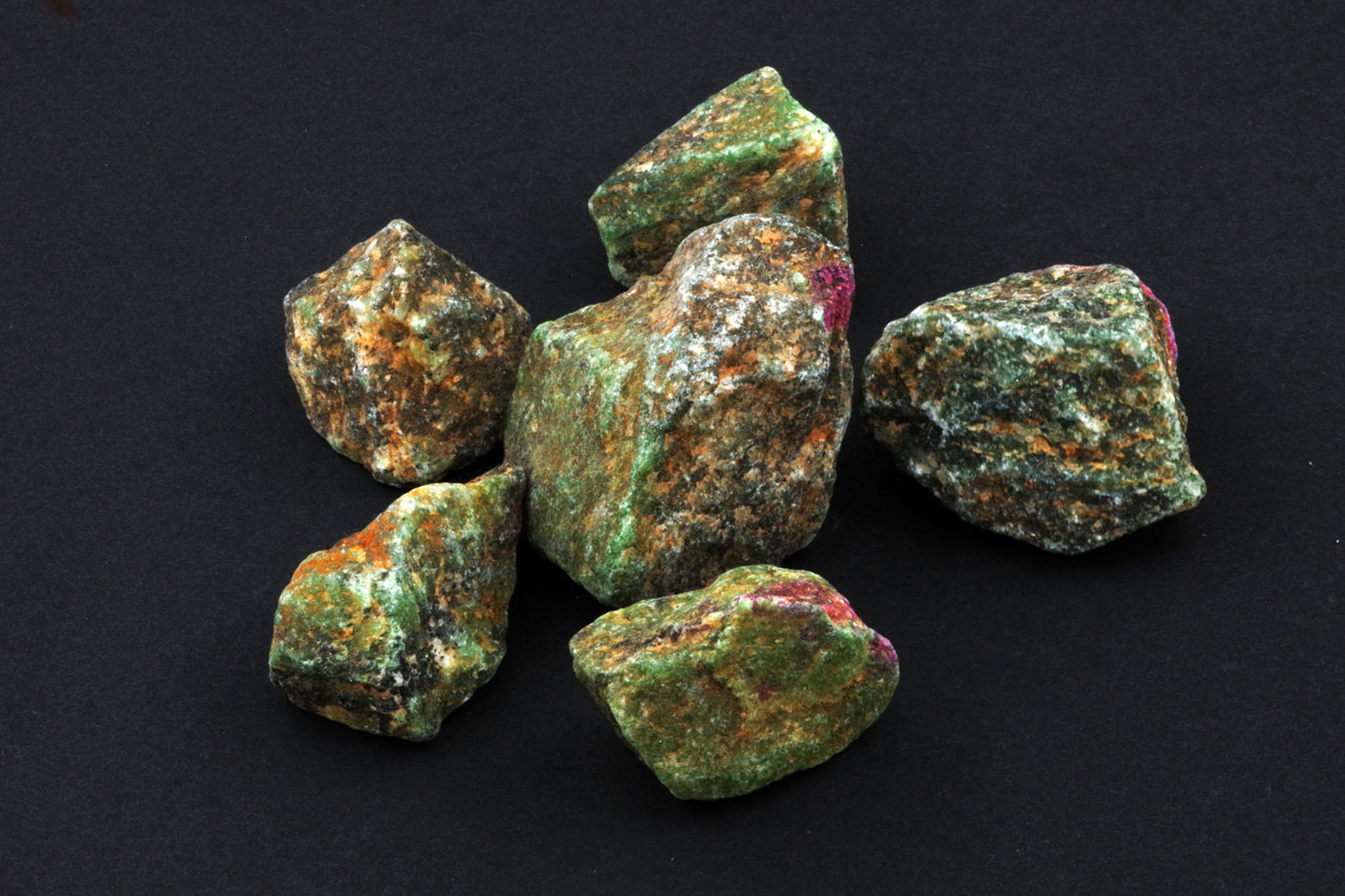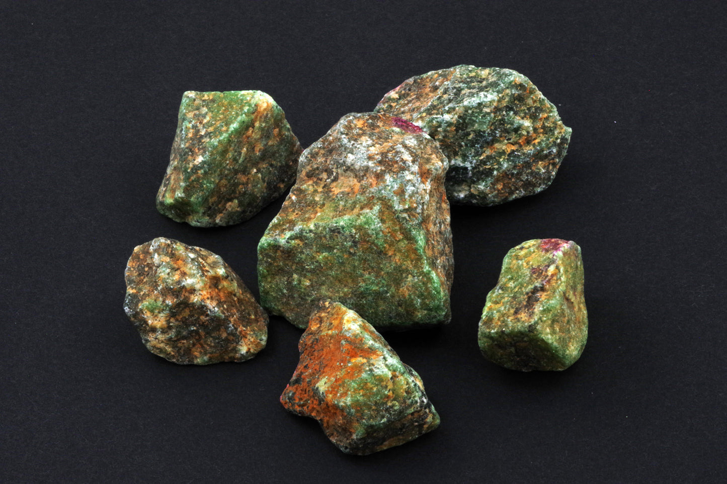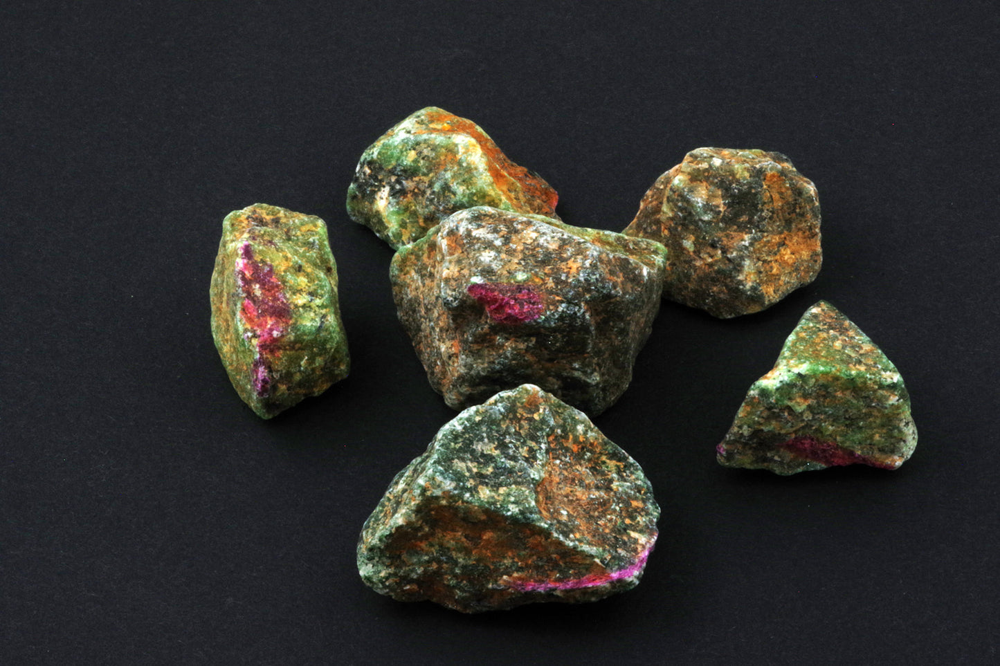 Sammansättning: Rubin är ett korundmineral, medan zoisit tillhör gruppen silikatmineraler.